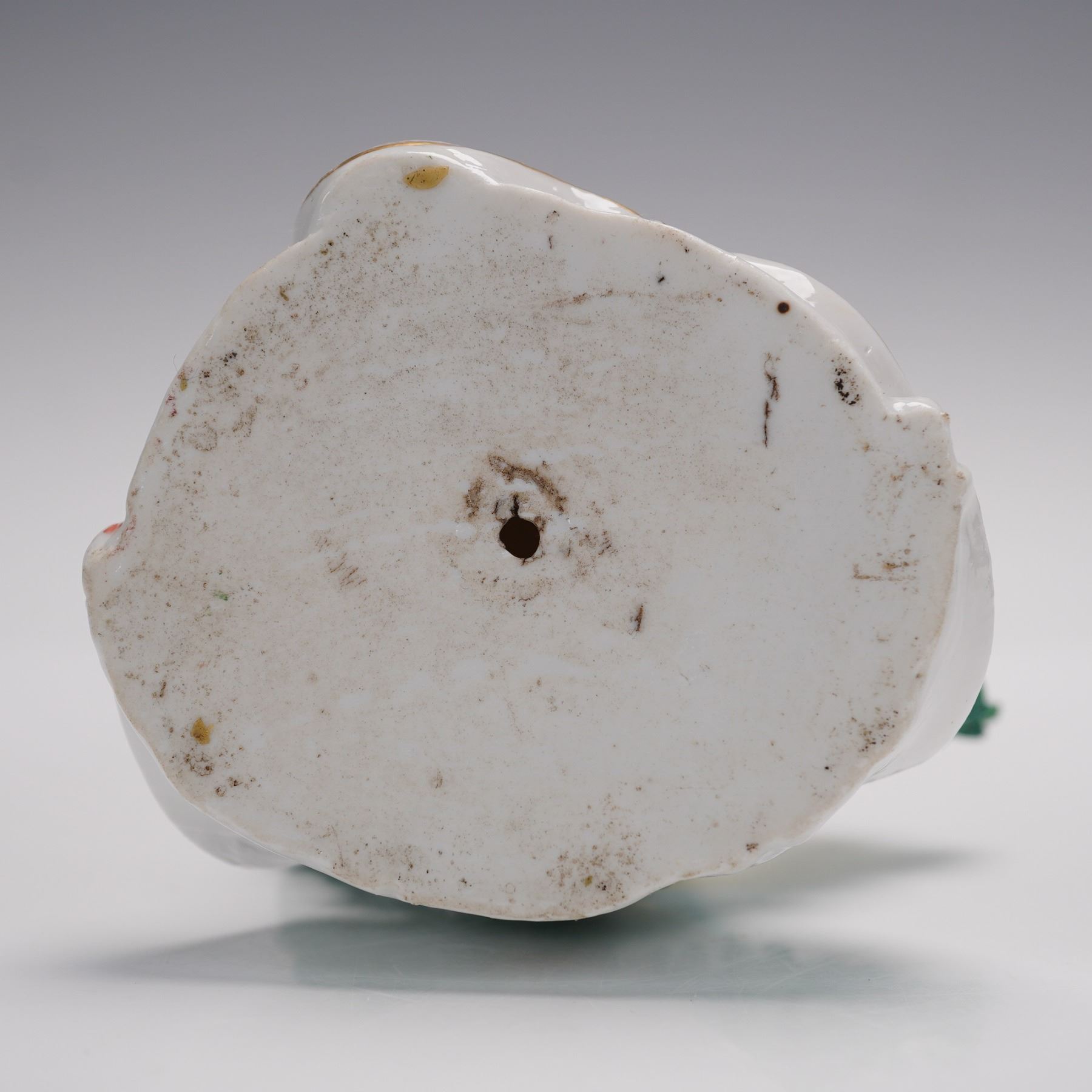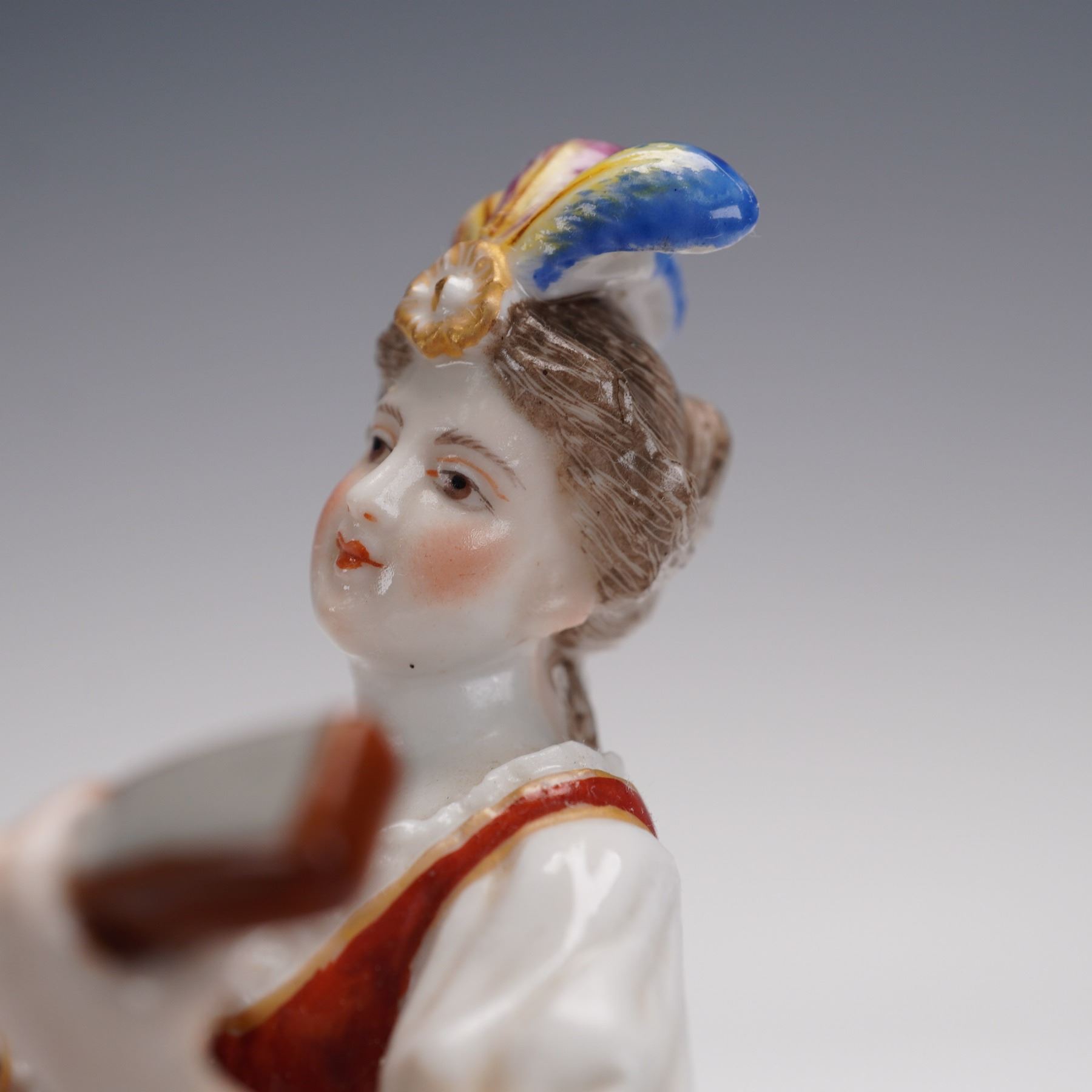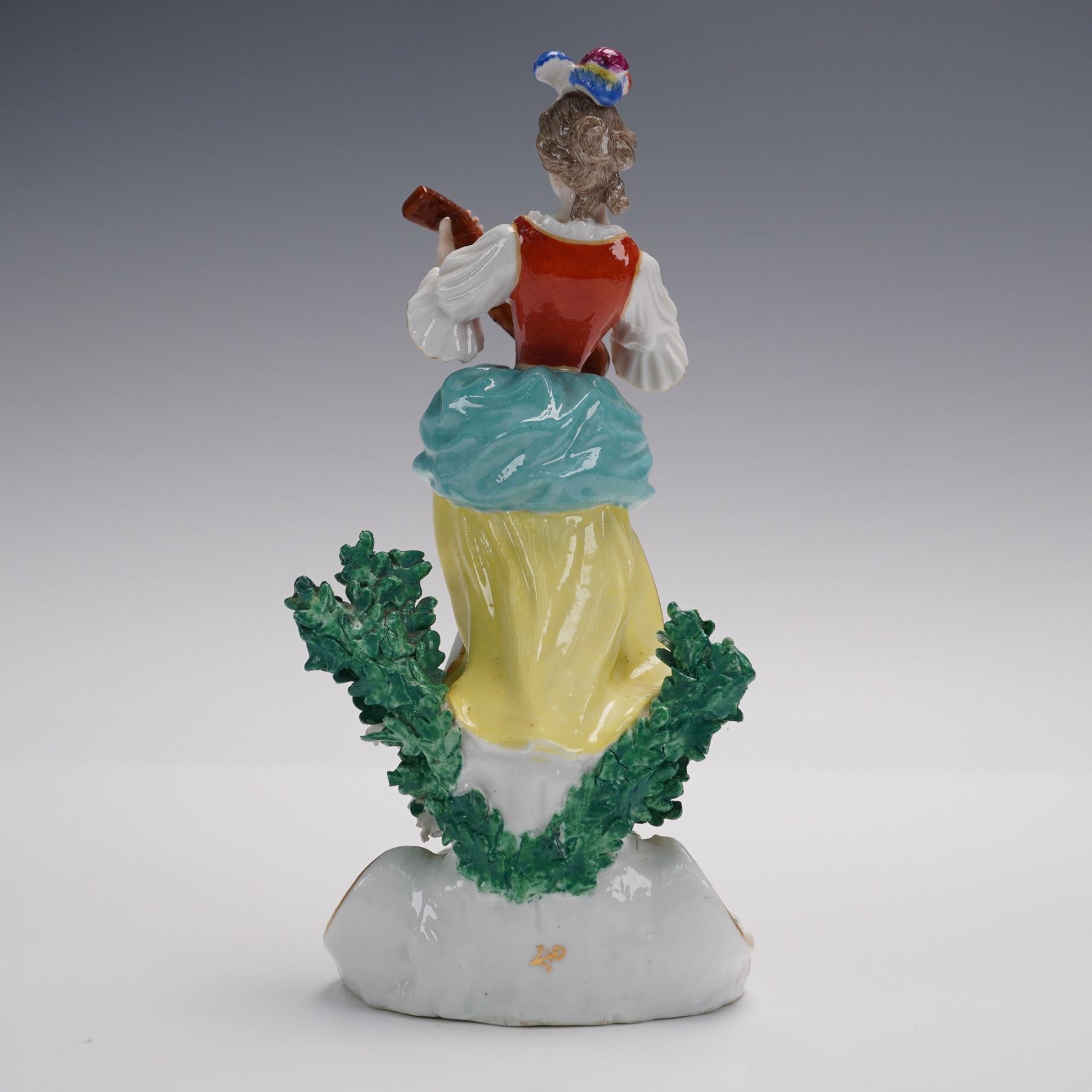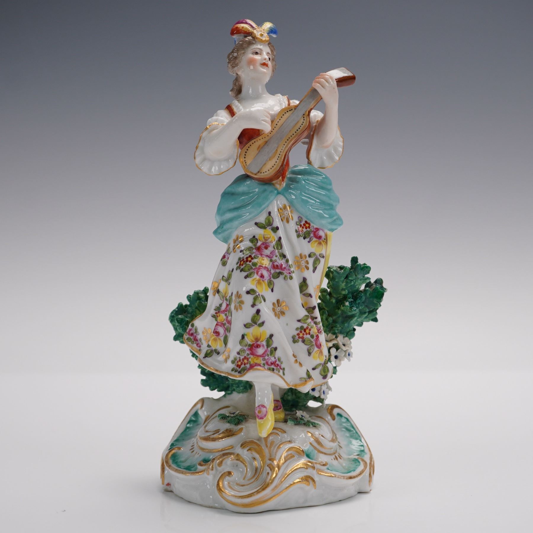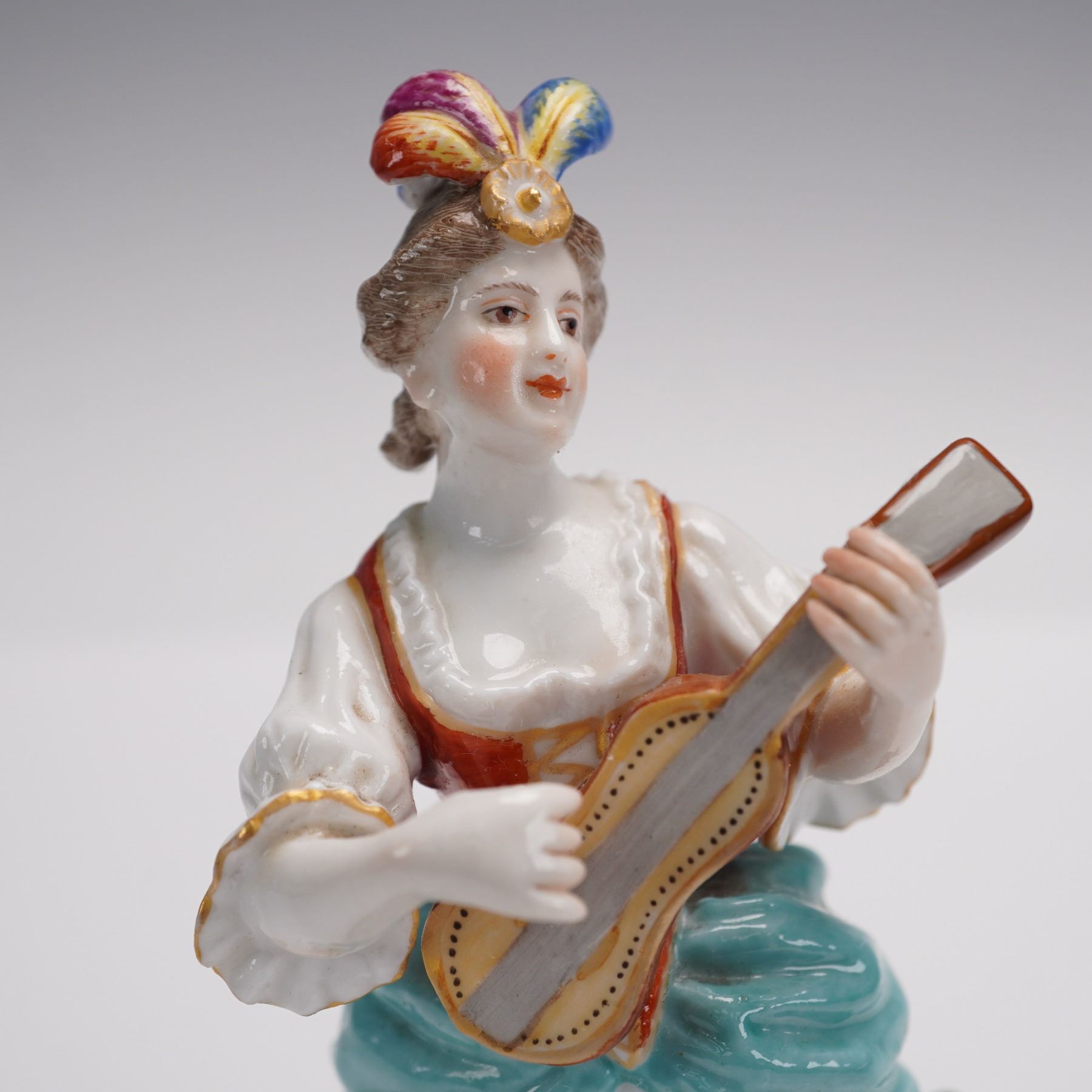 A finely detailed and hand painted porcelain figurine depicting a lady playing a stringed instrument. The figure stands on an ornate rococo style base accented with scrolling gilt decoration and green enameling. She is dressed in a vibrant multi colored floral skirt with a teal blue overskirt, and a red bodice accented with gold trim. Her elaborate headpiece features multicolored feathers adding a whimsical touch. The reverse of the figurine displays molded greenery and further gilded accents. Unrecognized backstamp.