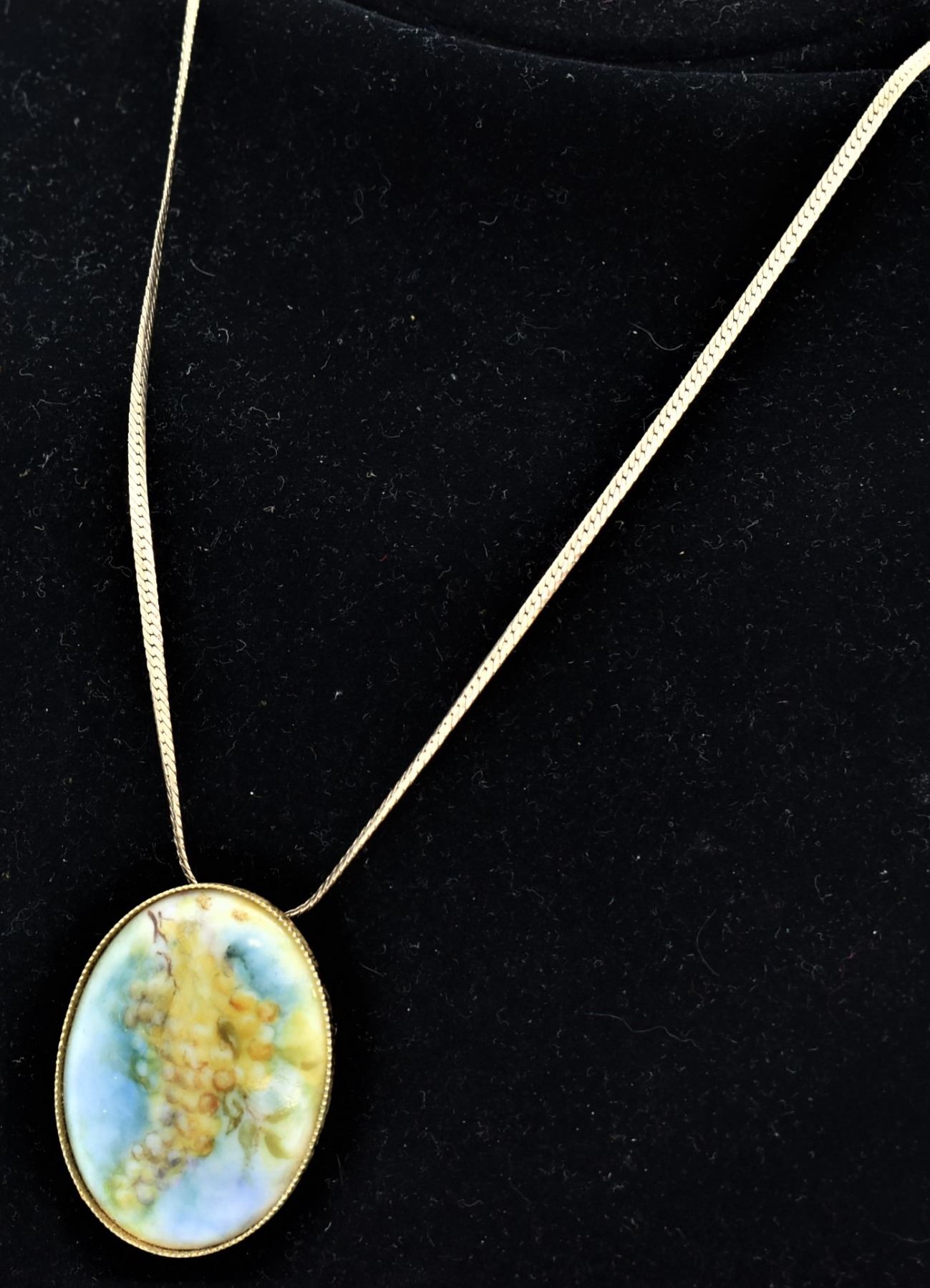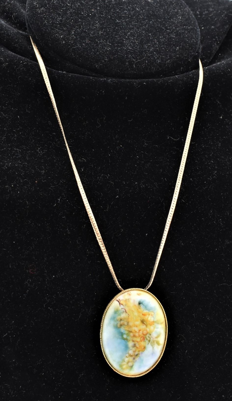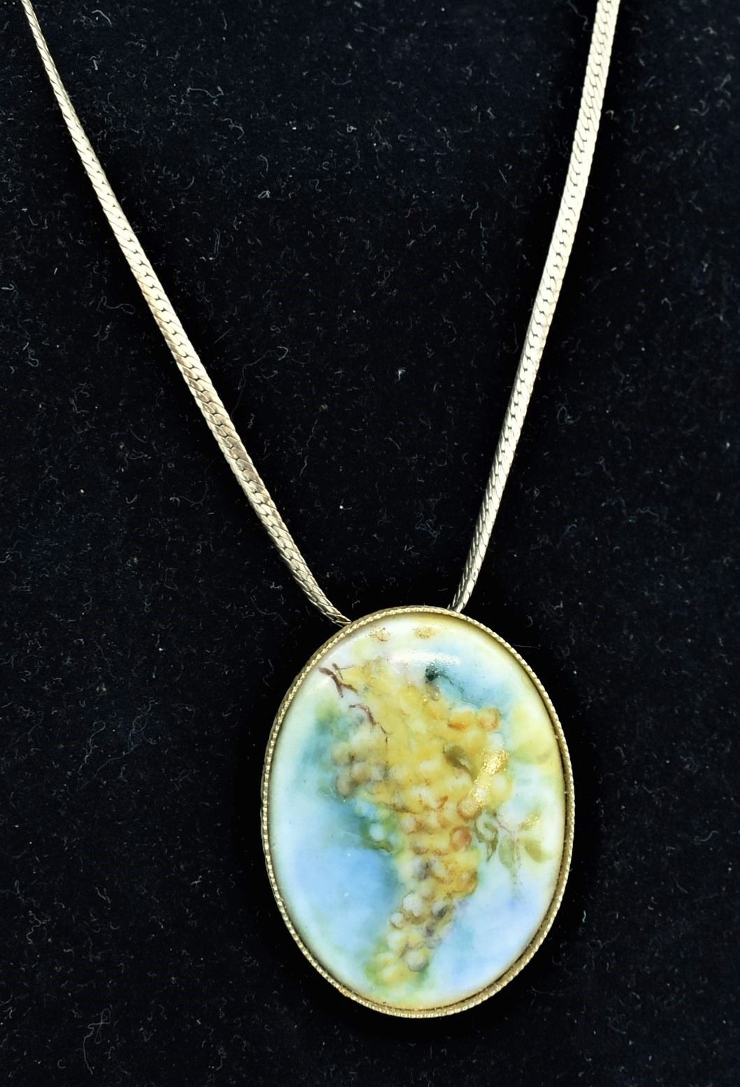 Hand Painted Porcelain Pendant Necklace, pendant measures 1.25''W x 1.5''L, the 14K gold filled chain measures 17''L end to end and is marked
