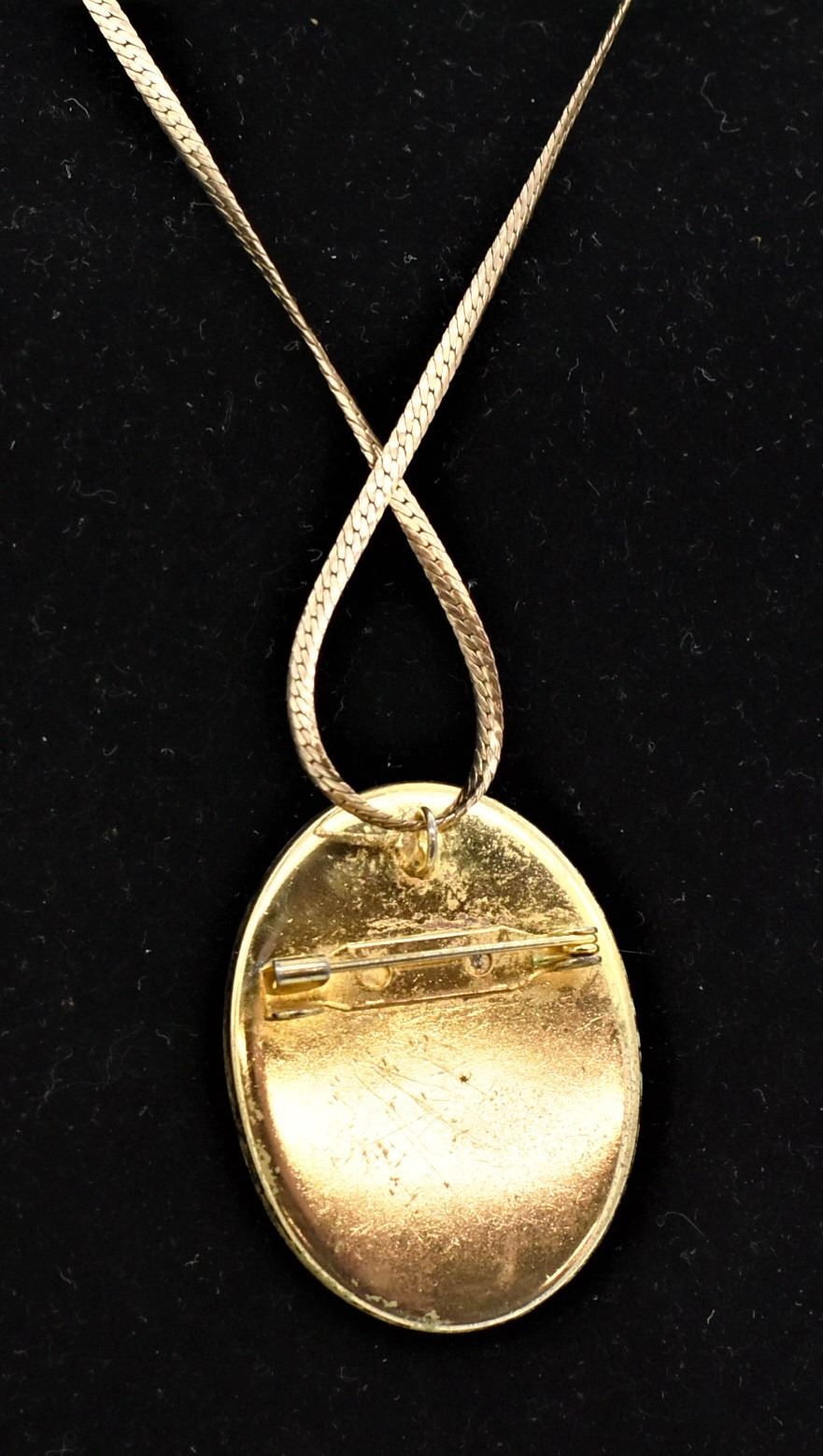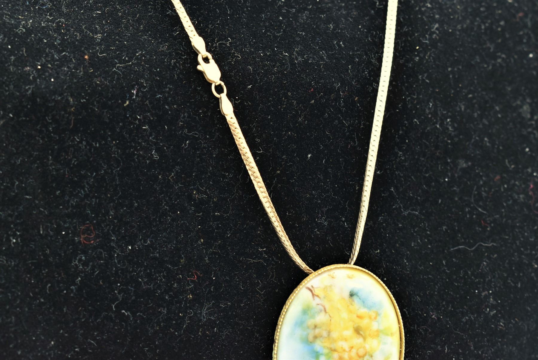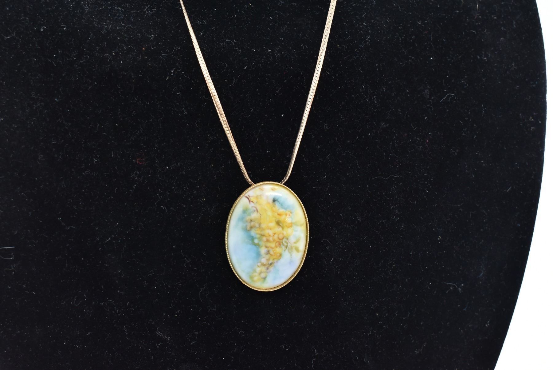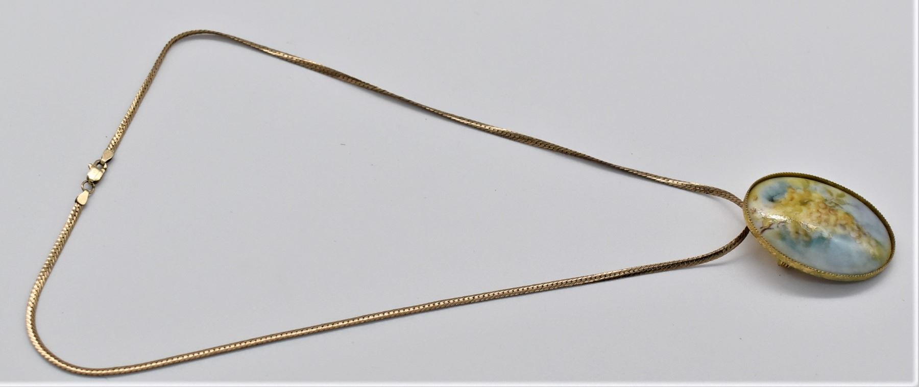 Hand Painted Porcelain Pendant Necklace, pendant measures 1.25''W x 1.5''L, the 14K gold filled chain measures 17''L end to end and is marked