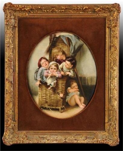 Description Not signed. Oval image depicting children in a basket. No damage or repairs. Condition (Excellent). Size Framed: 17" x 14".