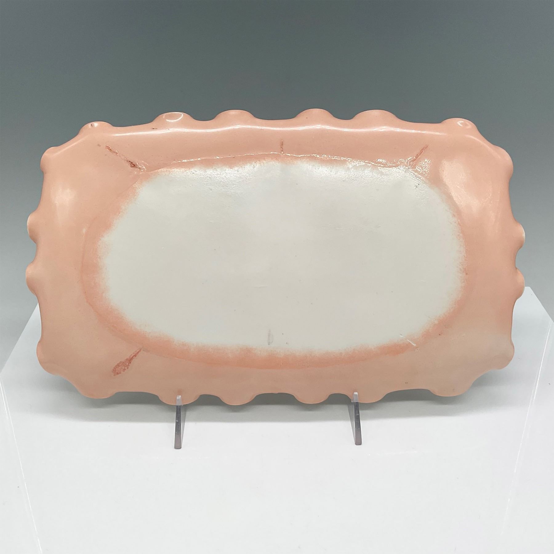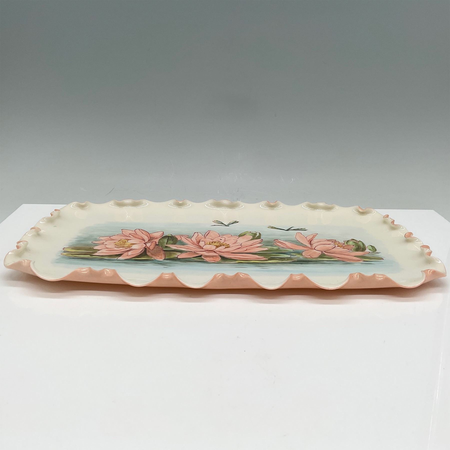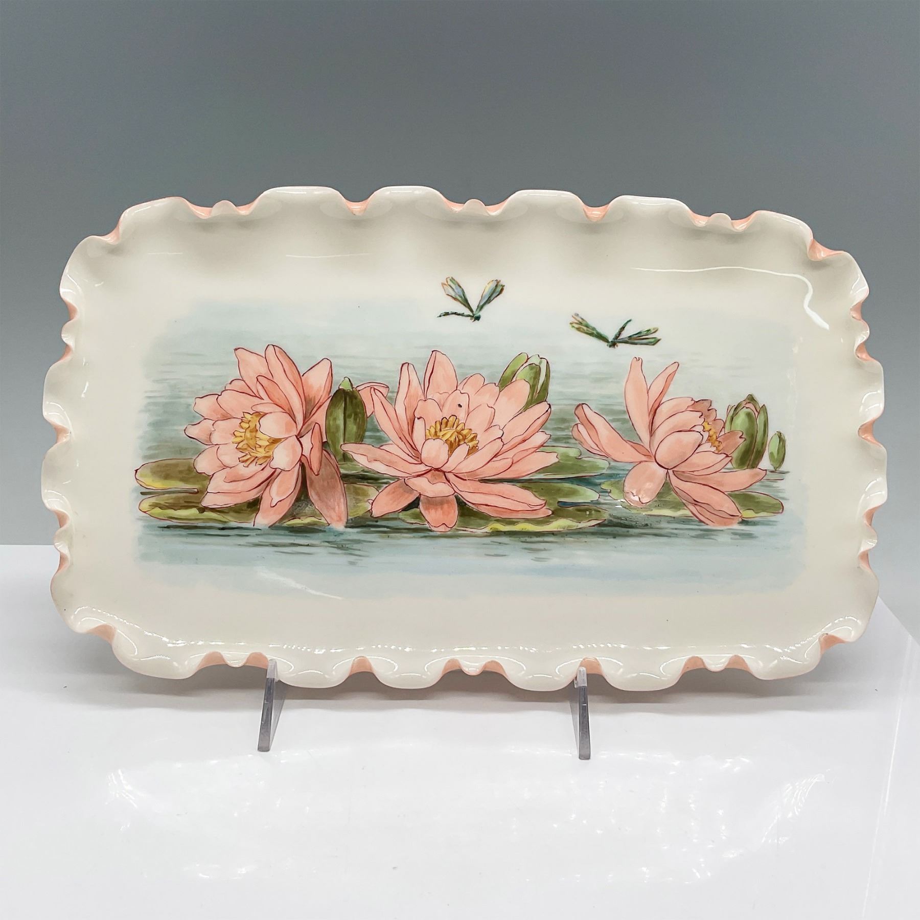 Beautiful hand-painted porcelain tray featuring a delicate water lily motif in soft pink hues, accented by dragonflies hovering above a tranquil pond. The tray has a scalloped edge with a subtle pink tint, enhancing its vintage charm. The underside is painted in a matching blush tone, with a smooth unglazed base. Likely an early 20th-century piece, this tray exhibits fine craftsmanship and an artistic aesthetic that makes it a lovely decorative or functional addition to any collection.