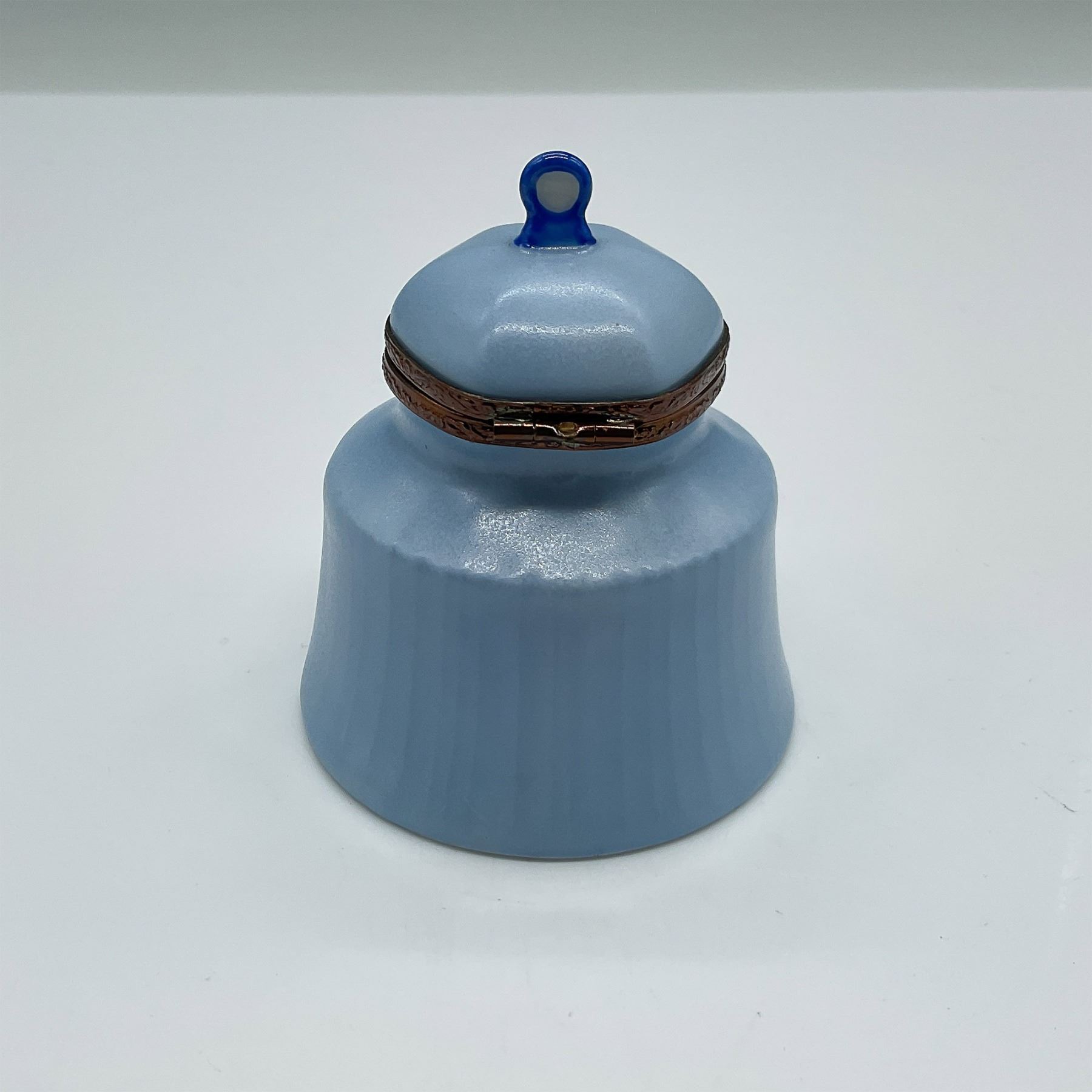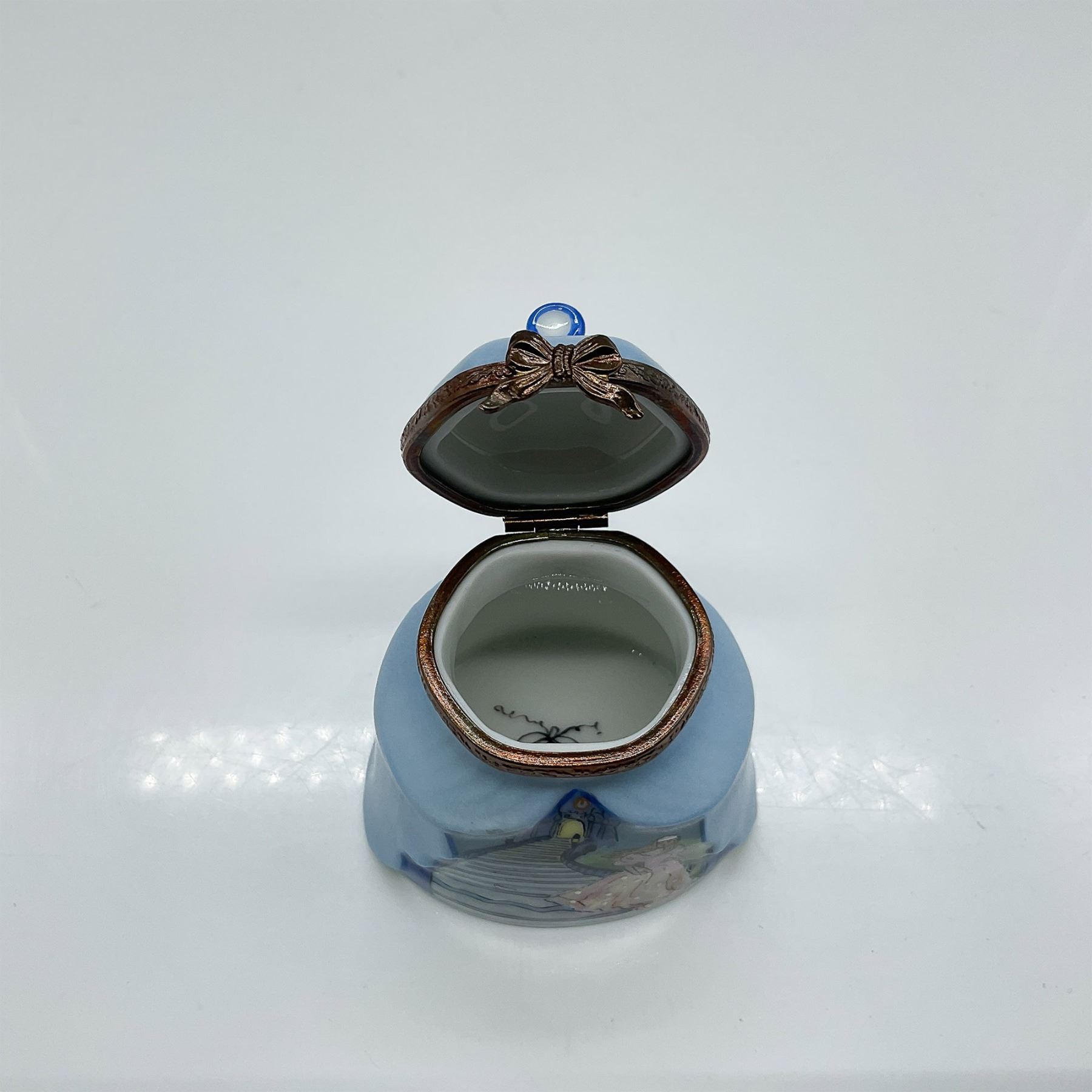 A charming Limoges France hand-painted porcelain trinket box featuring a Cinderella theme. This exquisitely crafted piece is shaped like a bell with a delicate blue glaze and an intricate scene depicting Cinderella leaving her glass slipper on the steps of the palace. The hinged box is adorned with a bronze-colored bow clasp, adding an elegant touch to the design. Inside holds Cinderella's crystal slipper. The bottom is marked Limoges France, Peint Main, indicating that it is hand-painted.