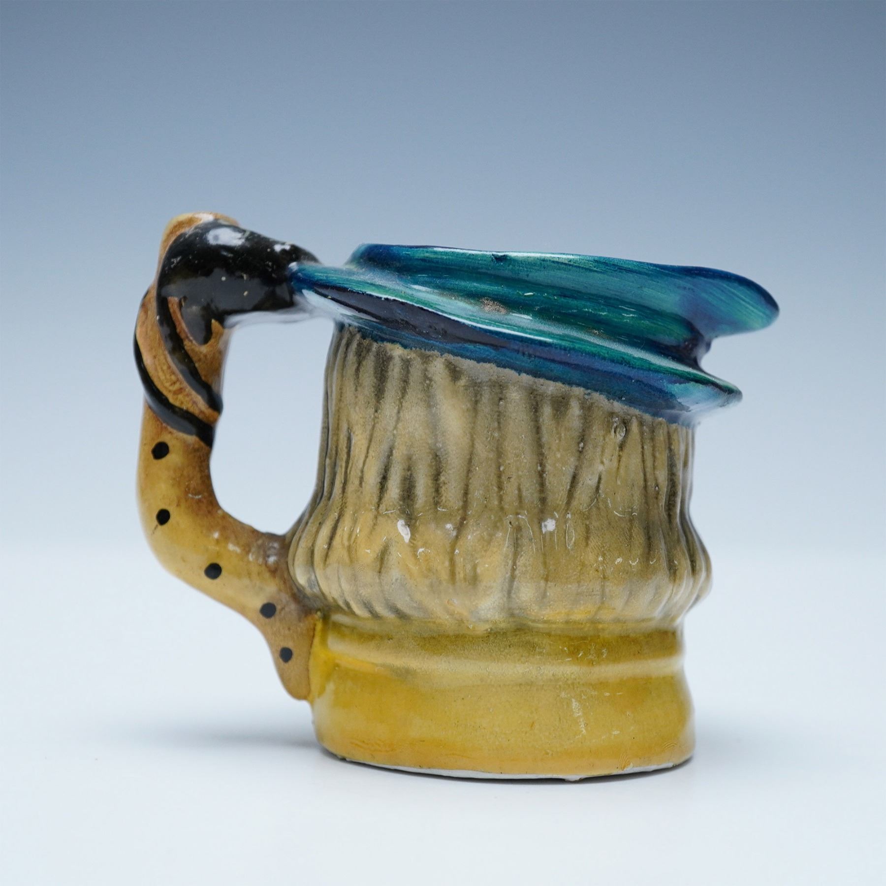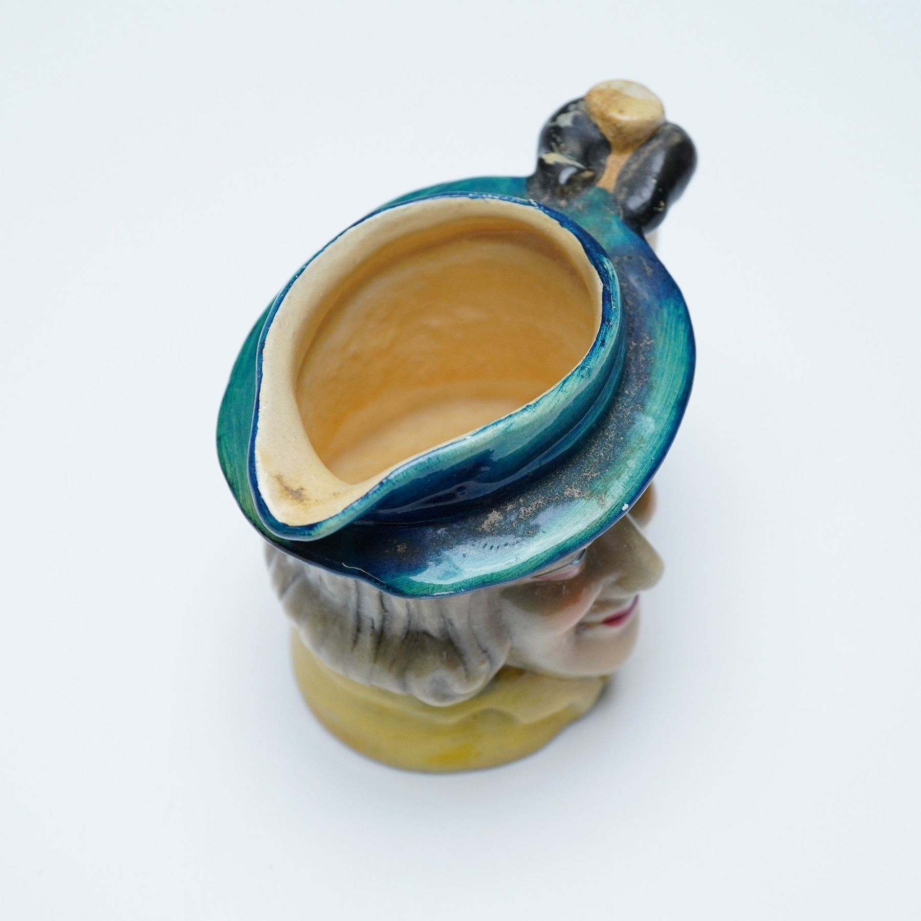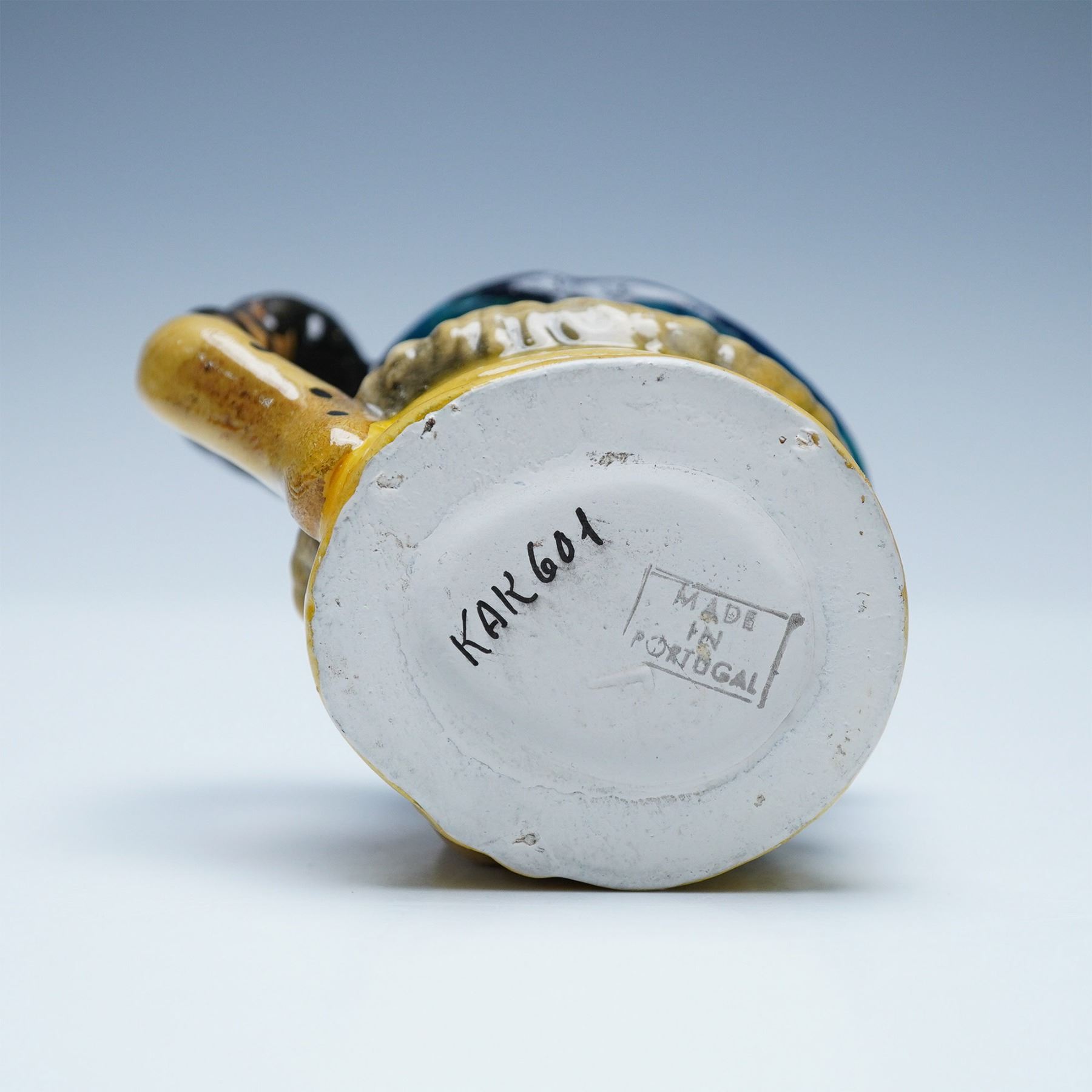 Whimsical hand-painted ceramic character toby jug, marked "Made in Portugal" on the underside. This expressive piece features a detailed face with a blue hat and a unique sculpted handle resembling a curved cane or walking stick. The jug is also hand-numbered KAK601, adding to its distinctive nature. A wonderful addition for collectors of toby jugs, Portuguese ceramics, or vintage hand-painted pottery.