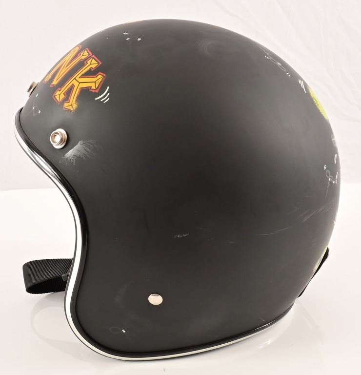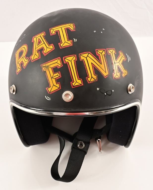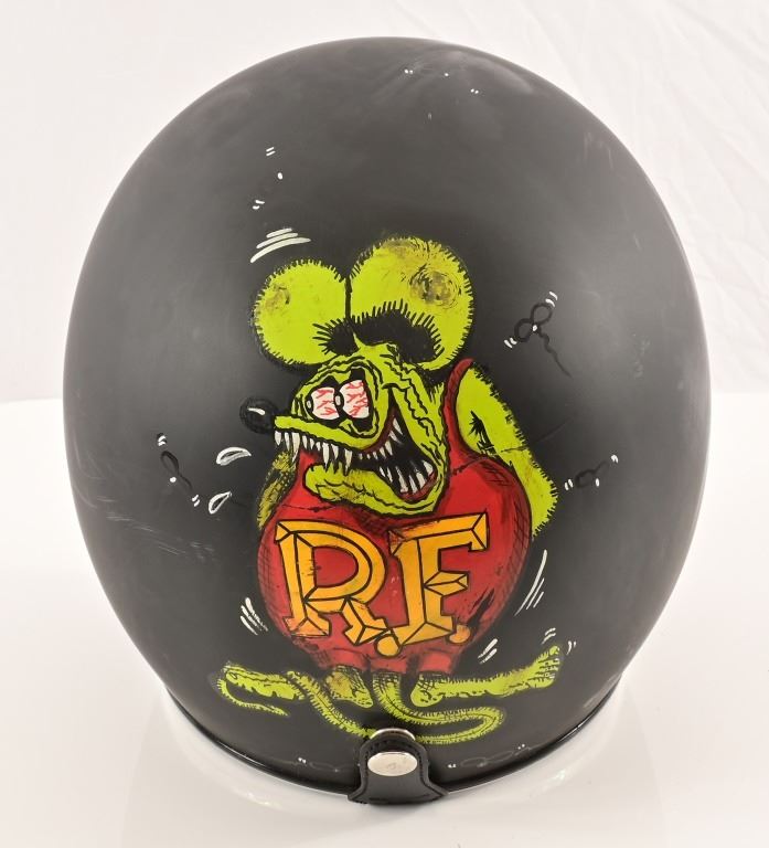 Very good, Unknown artist rendition of Ed "Big Daddy" Roth's "Rat Fink" character. Does have some nicks, here and there, but overall a cool hand-painted hotrod display piece. Manufactured by Biltwell and intended as a Novelty helmet.