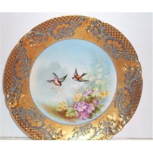 This extremely STUNNING Hand Painted Limoges Plate is decorated with two red headed birds and lovely blooming flowers. The outside edge of the plate is heavily gold gilt and has a blue hand painted design. This plate is in SUPERIOR condition with no chips, cracks, dings or hairlines and it measures 7.50" in diameter. It is also artist signed by the French Factory Artist Golse. The plate is marked on the back with the familiar Limoges Logo.