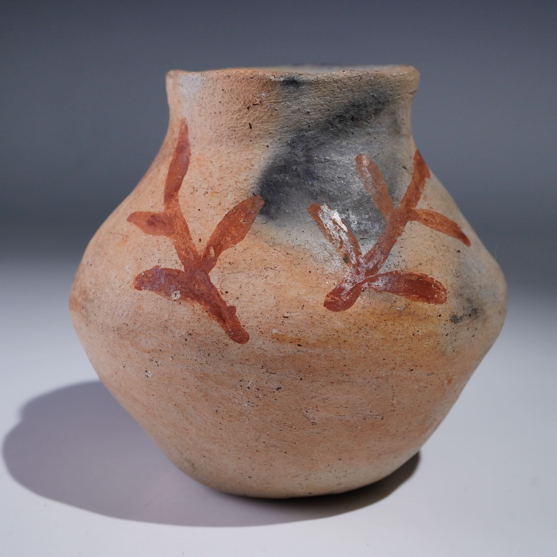 Rounded redware pottery vessel featuring hand painted rust-red leaf and stem motifs around the sides. The surface shows natural gray and buff firing variations with a subtle smoky finish near the rim. The form is slightly asymmetrical with a tapered neck and wide belly. Unmarked base. Measures approx. 3.75"H.