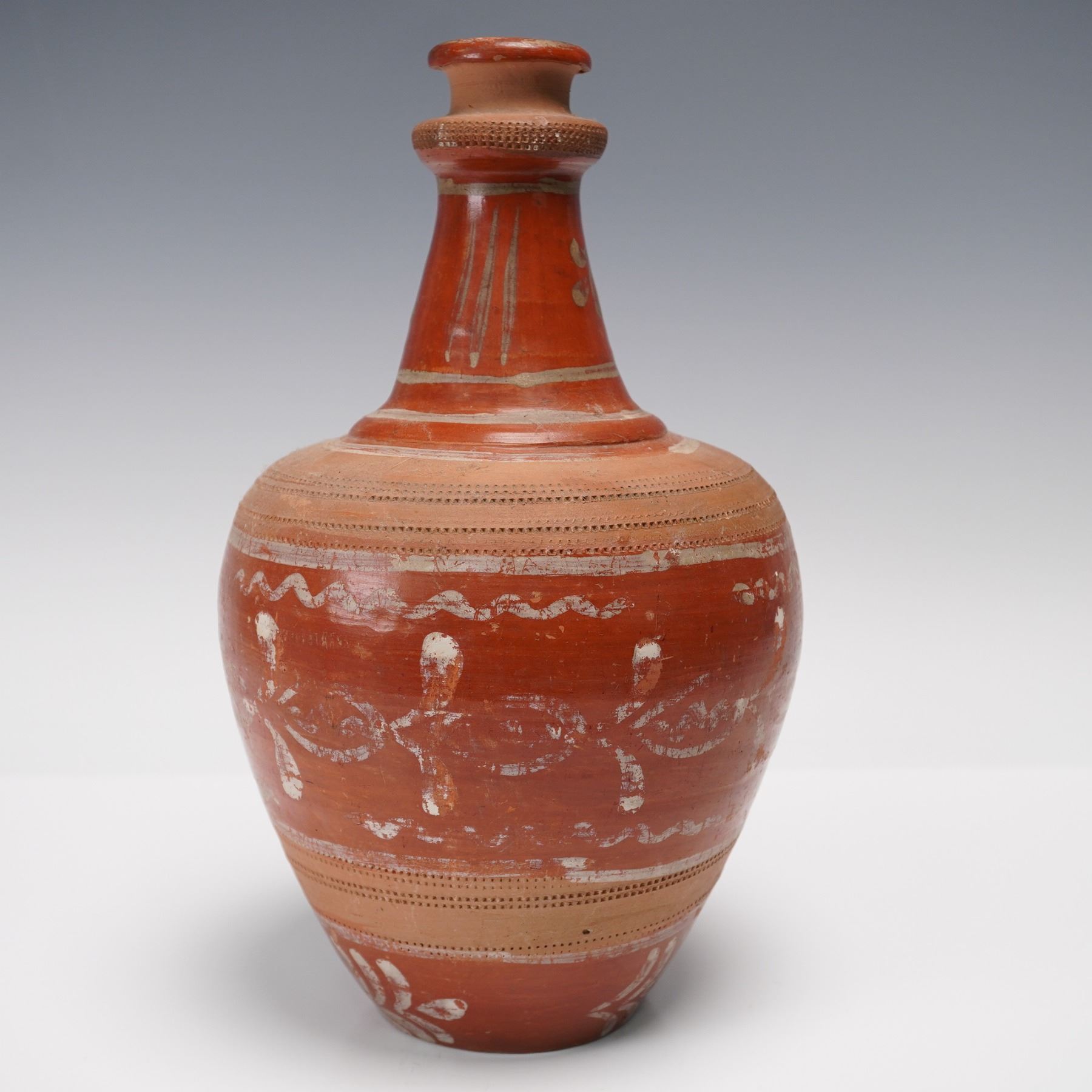 A large hand-thrown terracotta vessel in red earthenware, decorated with white slip floral motifs and dotted linear bands. The form features a broad ovoid body tapering to a tall, conical neck with a flared mouth and banded knuckle collar for grip. Traditional in style and likely originating from South Asia or the Middle East, the piece was likely intended for domestic use such as water or grain storage. The surface exhibits hand-incised decoration and wheel-thrown striations beneath the glaze, adding to its rustic, folk-crafted charm.