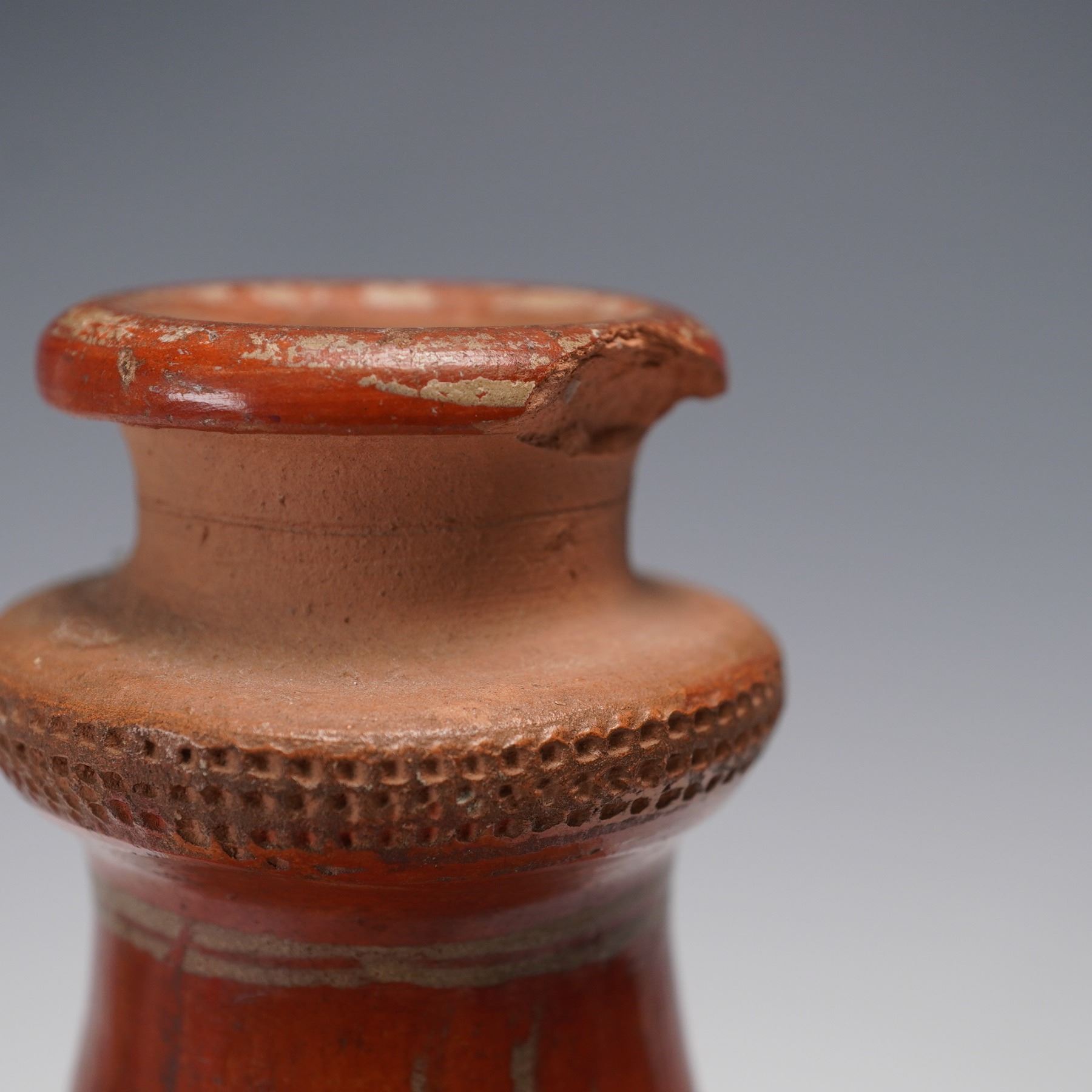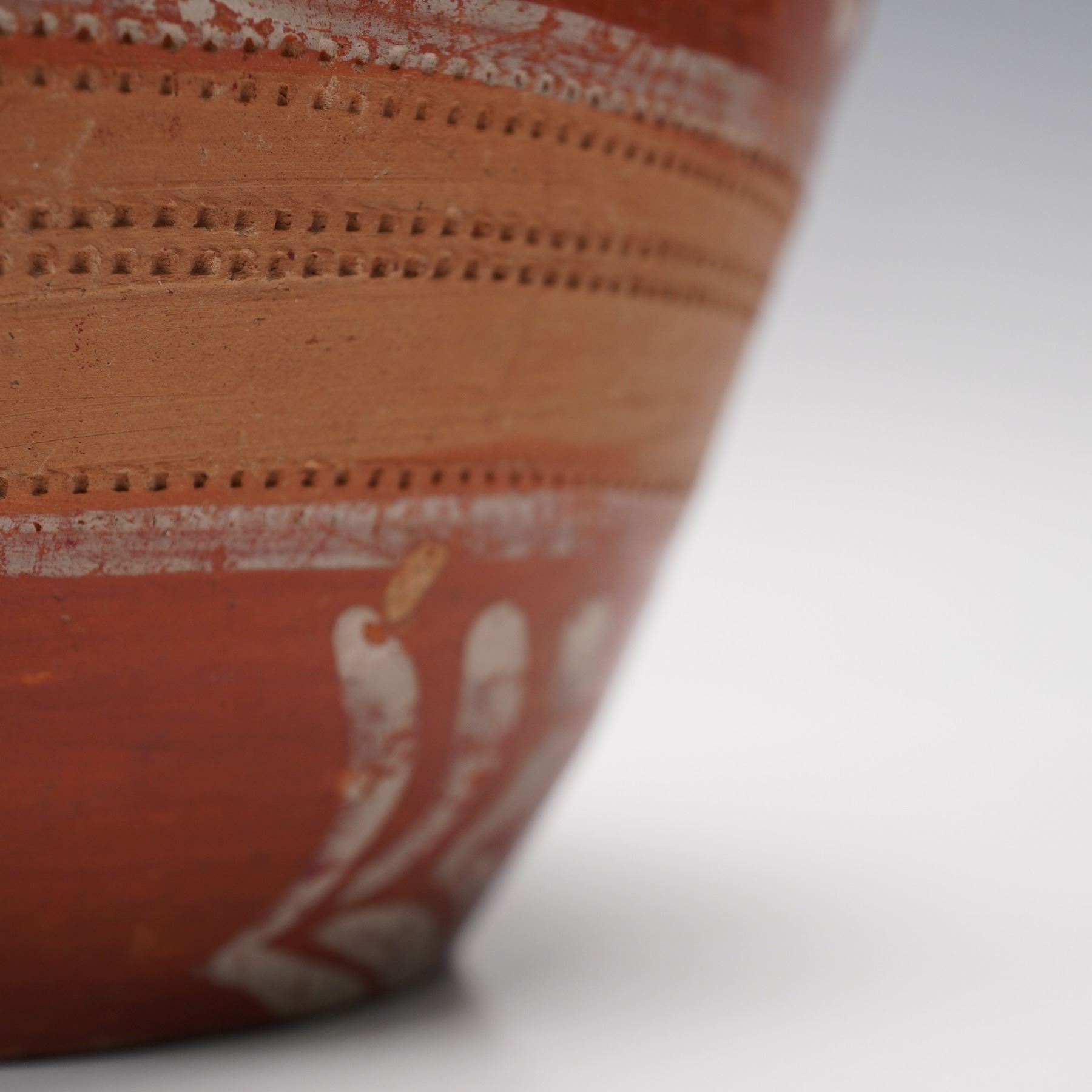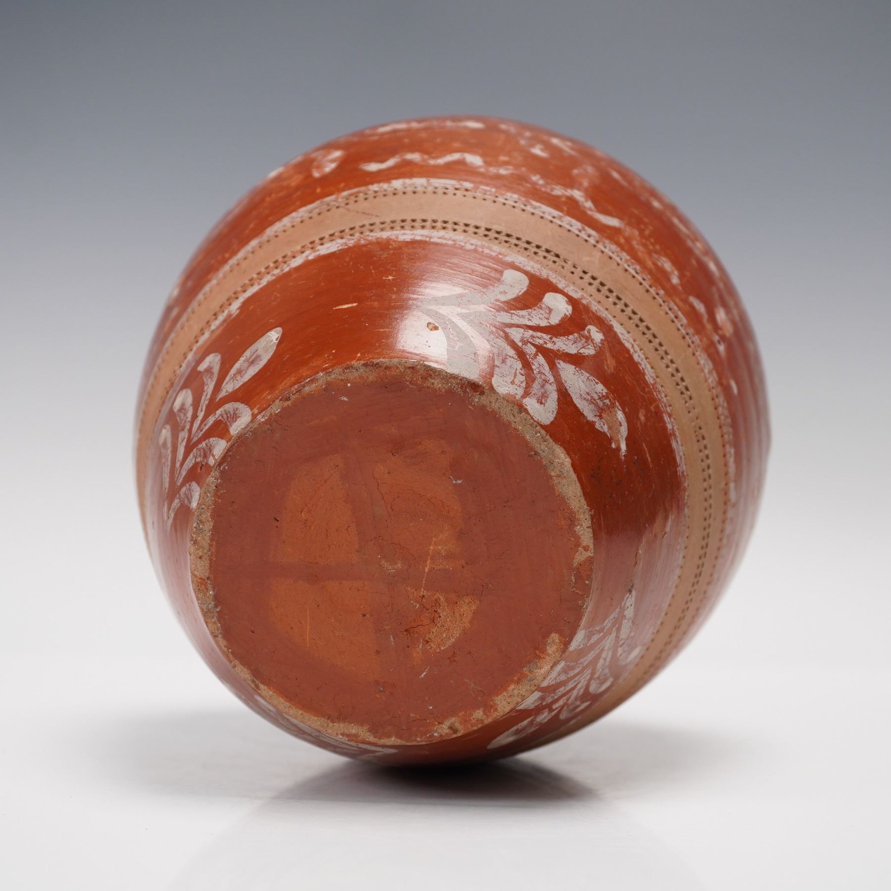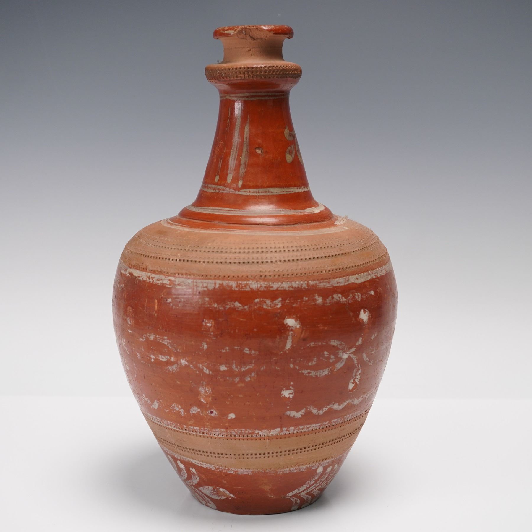 A large hand-thrown terracotta vessel in red earthenware, decorated with white slip floral motifs and dotted linear bands. The form features a broad ovoid body tapering to a tall, conical neck with a flared mouth and banded knuckle collar for grip. Traditional in style and likely originating from South Asia or the Middle East, the piece was likely intended for domestic use such as water or grain storage. The surface exhibits hand-incised decoration and wheel-thrown striations beneath the glaze, adding to its rustic, folk-crafted charm.