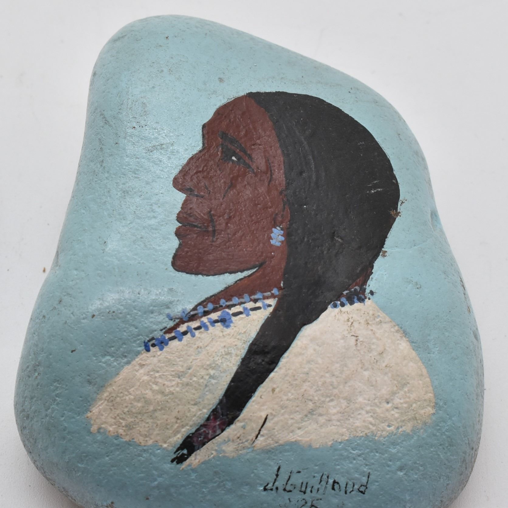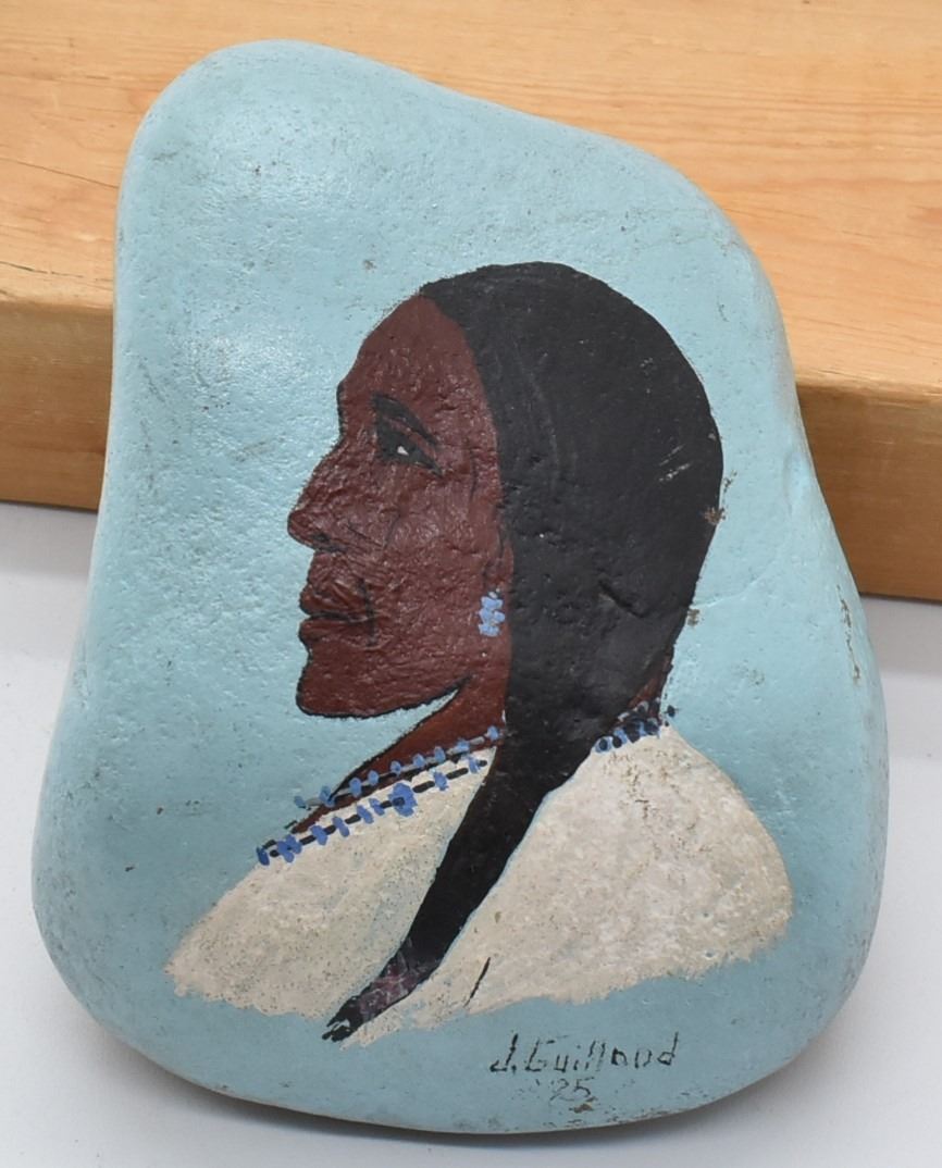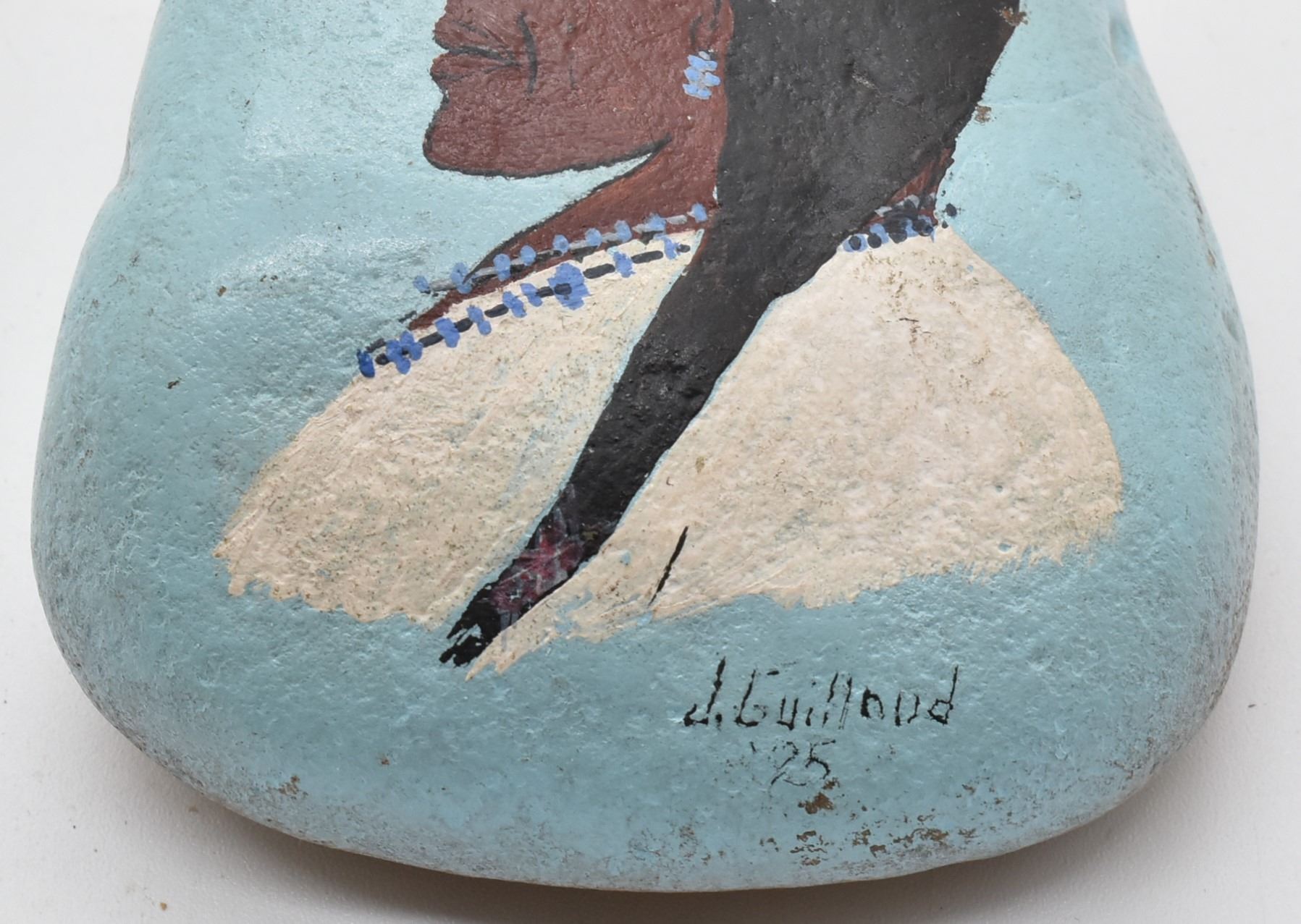 Hand Painted Rock Art by J. Guilloud, measures 2'' x 3.5'' x 4.5'' and is signed