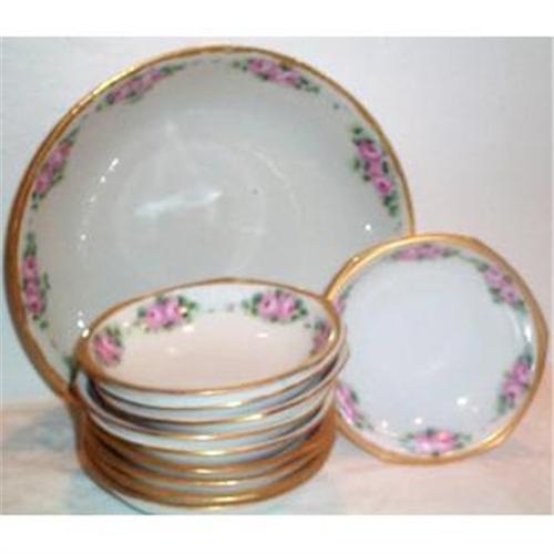 We are offering you one complete Hand Painted Rose Decorated Berry Bowl set all for one money. This berry bowl set will consist of ten (10) small berry bowls that measure 5.25" in diameter and stand 1.50" tall. Each of the ten bowls is in SUPERIOR condtiion with no chips, cracks, dings or hairlines and the set will also contain one large Berry Bowl that measurs 9" in diameter and stands about 2.50" tall. This bowl has a small chip under the rim that can only be seen when it is turned over. This particular pattern matches many of the other items we currently have for sale including dinner plates, reticulated plates, cream and covered sugar, cups and saucers, bud vase, berry bowl set, napkin ring, salt shaker, and demitasse cups and well as a footed dresser box that has two separate lids making it either a powder jar or a hair receiver. Please see our other items for the balance of this STUNNING Hand Painted Set.