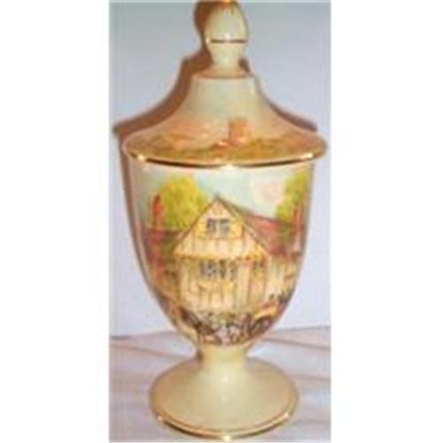 This fantastic Hand Painted Footed Covered Candy is decorated with the Royal Winton Happy Days Pattern and is in SUPERIOR condition with no chips, cracks, dings or hairlines. The covered candy measures 3.75" in diameter and stands 9" tall to the top of its wonderful finial. It is marked on the bottom with the familiar Royal Winton Logo.