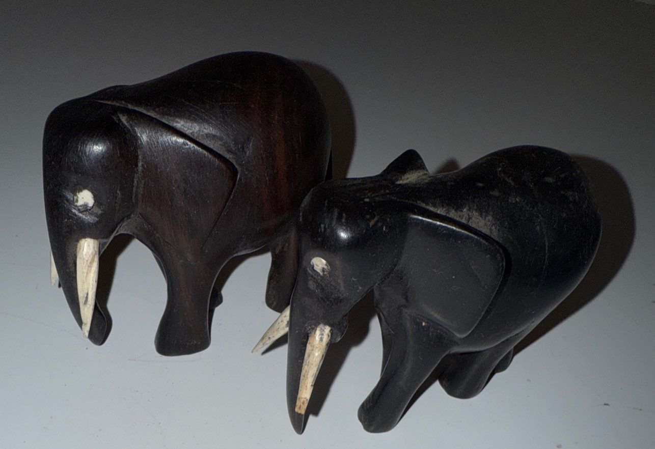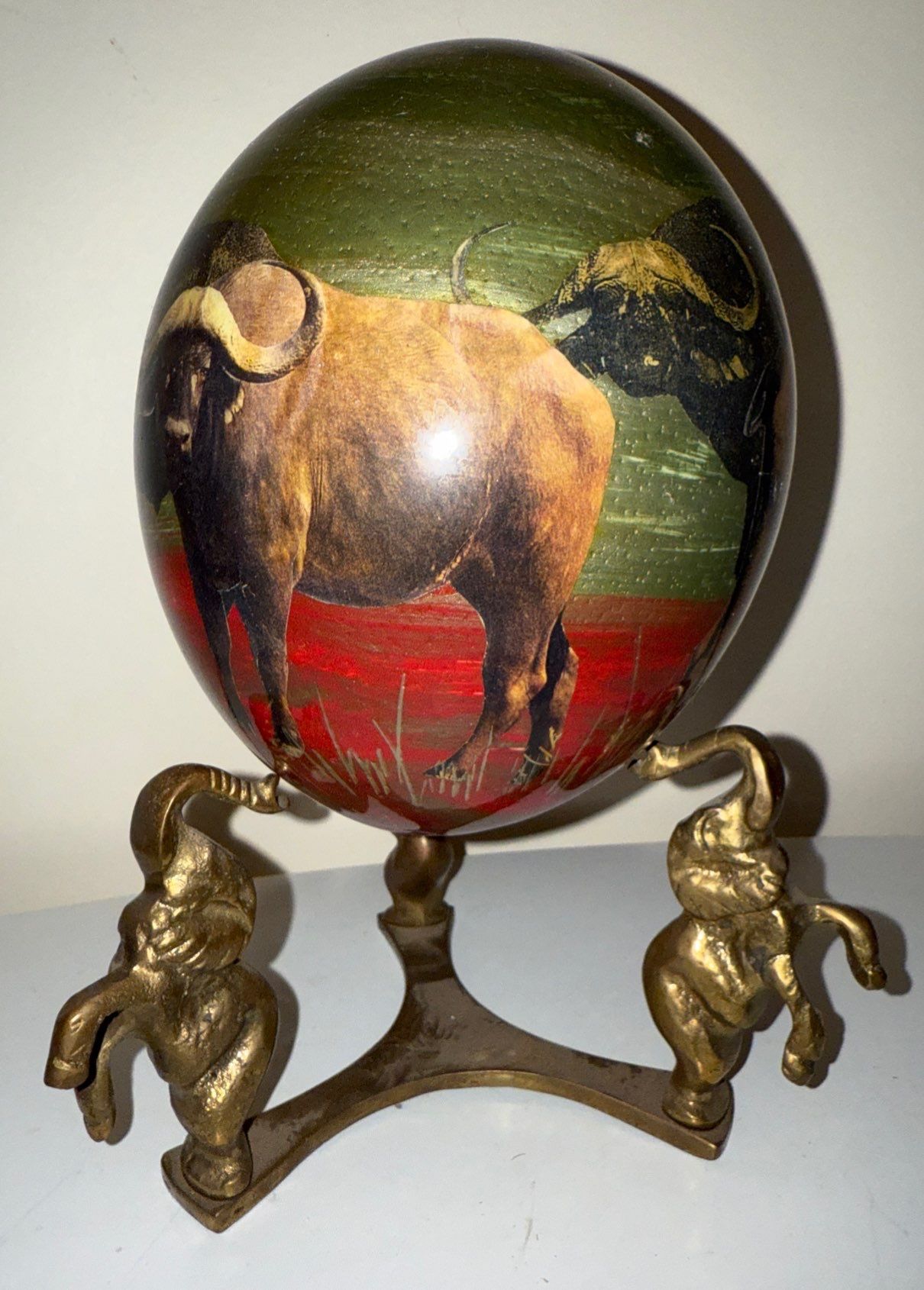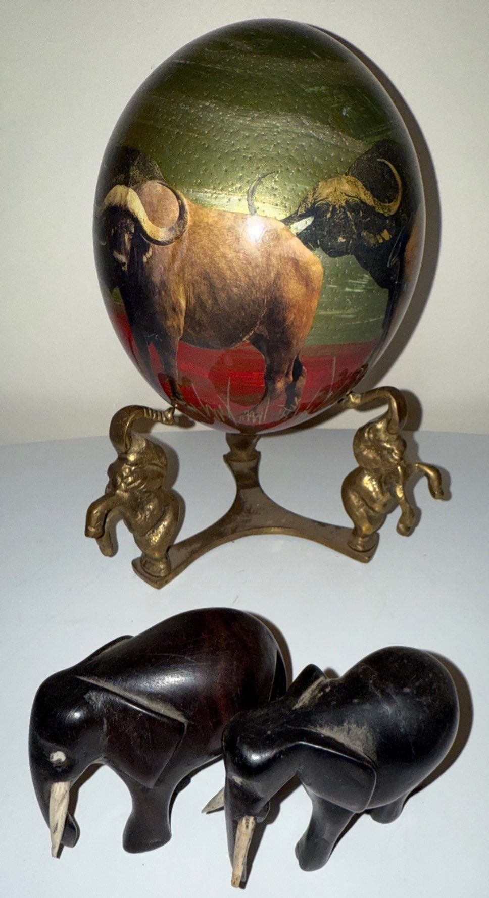 Hand Painted Safari Ostrich Egg w/brass stand & Two Elephant Figurines 8"tall