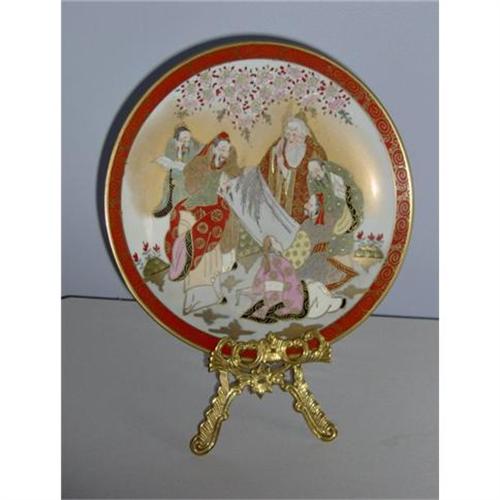 Although this is a Japanese design, it is Chinese-made. The base of the plate shows a mark with characters within a square and the words, "Hand Painted Satsuma" and "UNDER STRICT SUPERVISION BY H.F.P. MACAU" and "MADE IN CHINA". This plate is for decorative purposes and is not for food use.<p>