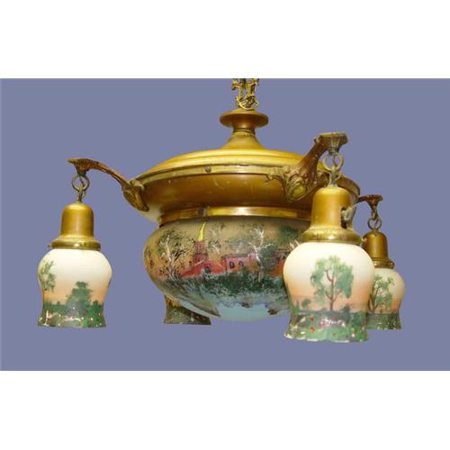 Nice set of four hanging hand painted spring landscape scene 4 1/2 inch shades complemented by a similar lake village scene hand painted large center globe measuring 11 inches in diameter adorning a period circa 1920 ceiling fixture with gilt brass with acanthus leaf stylized arms and its original turn-key sockets and which would make a stupendous addition to and fine household or collection. Size: 19 inches Height, 25 inches Width.