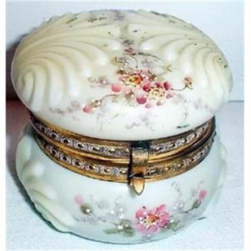 This fantastic Hand Painted Wavecrest Covered Box is decorated with a lovely Floral design and is in SUPERIOR condition with no chips, cracks, or dings and even its original brass closures are in excellent condition. What makes this box really unusual is that it is shaped like a shell. This box measures about 3.5" in diameter and stands about 2.50" tall. It is marked on the bottom with the familiar Wavecrest Photo.