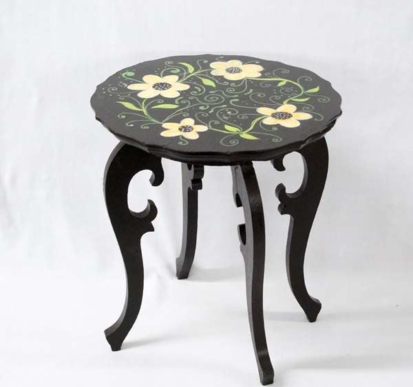 Hand Painted Side Table by Kathy Kills Thunder, measures 14''W x 15''H, Artist Bio: Kathleen Kills Thunder (her legal name) was born in 1947 in Seattle, WA. Her father, Ben Kills Thunder, was a Sioux Indian from the Fort Peck Indian Reservation in NE Montana. Her mother was Spanish/Irish. Kathy grew up shuttling back and forth between Seattle and the Colville Indian Reservation in NE Washington. Kathy has been painting and beading since she was six. She uses a bright color palette and prodigious imagination in creating her painted and beaded work. Kathy currently lives in SE Arizona and raises buffalo when she is not pursuing her artistic endeavors.