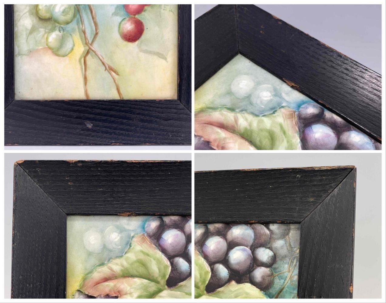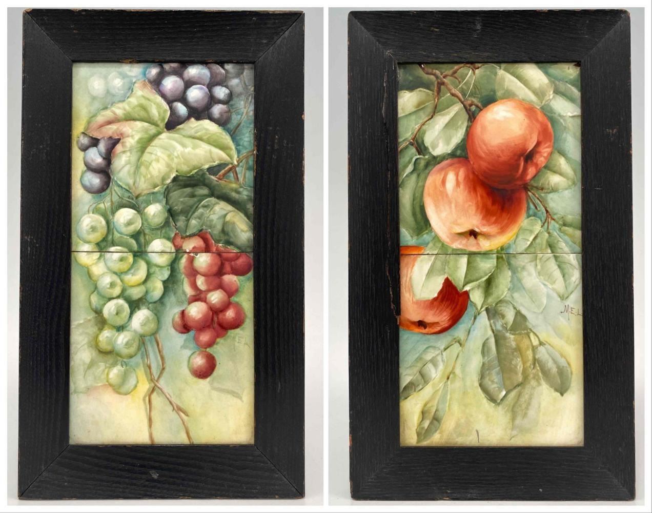 Hand Painted Tile Sets With Apple And Grape Themes, Signed M.E.L. Tiles Marked TRENT. Approximately 14.75L x 8.5W in. Sight Approximately 11.75L x 5.5W in. Each Tile Approximately 6.0L x 6.0W in.