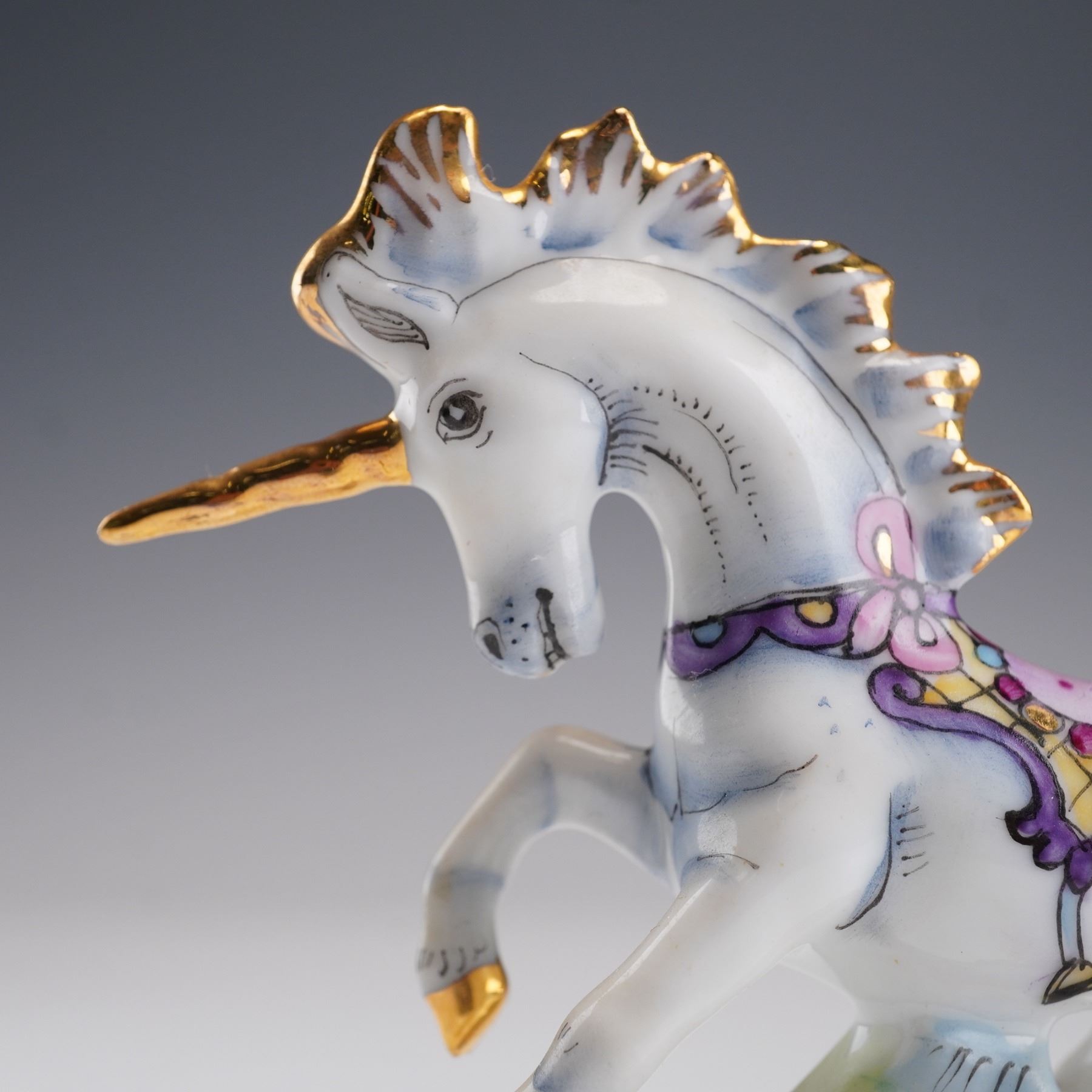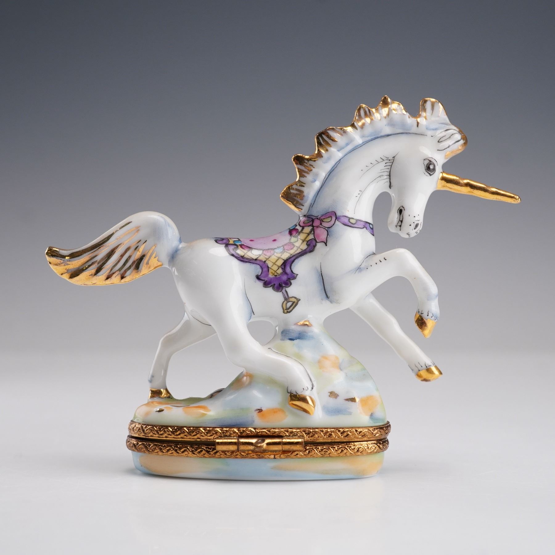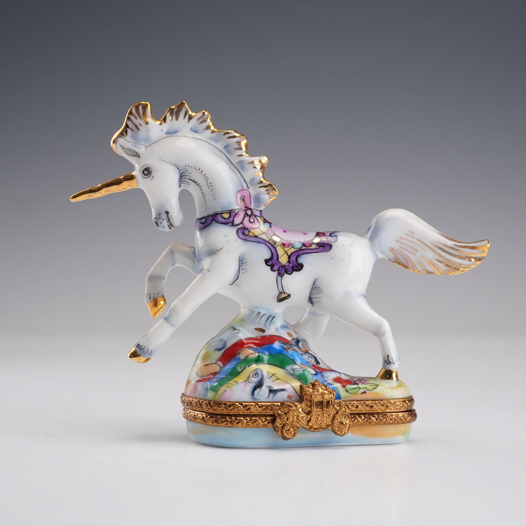 This beautiful hand-painted unicorn ring box is crafted in France, featuring a stunning depiction of a unicorn with a flowing mane, adorned in colorful accents. The detailed artwork captures the unicorn's grace as it stands atop a vibrant base. The piece is signed Peint main on the bottom, marking it as a hand-painted collectible. With its elegant design and use of rich colors, this box is perfect for both collectors of fine porcelain and those seeking a whimsical yet functional piece of art.