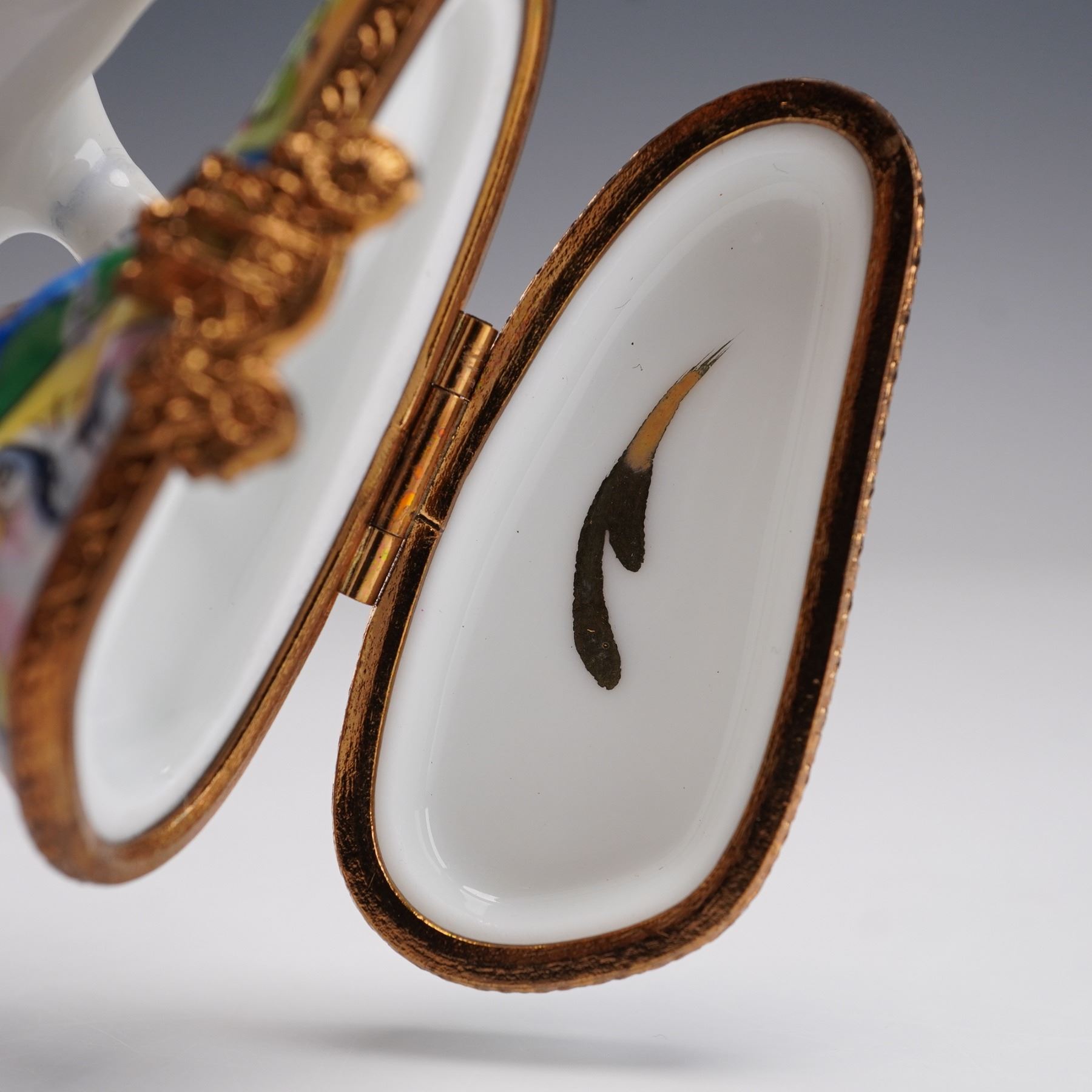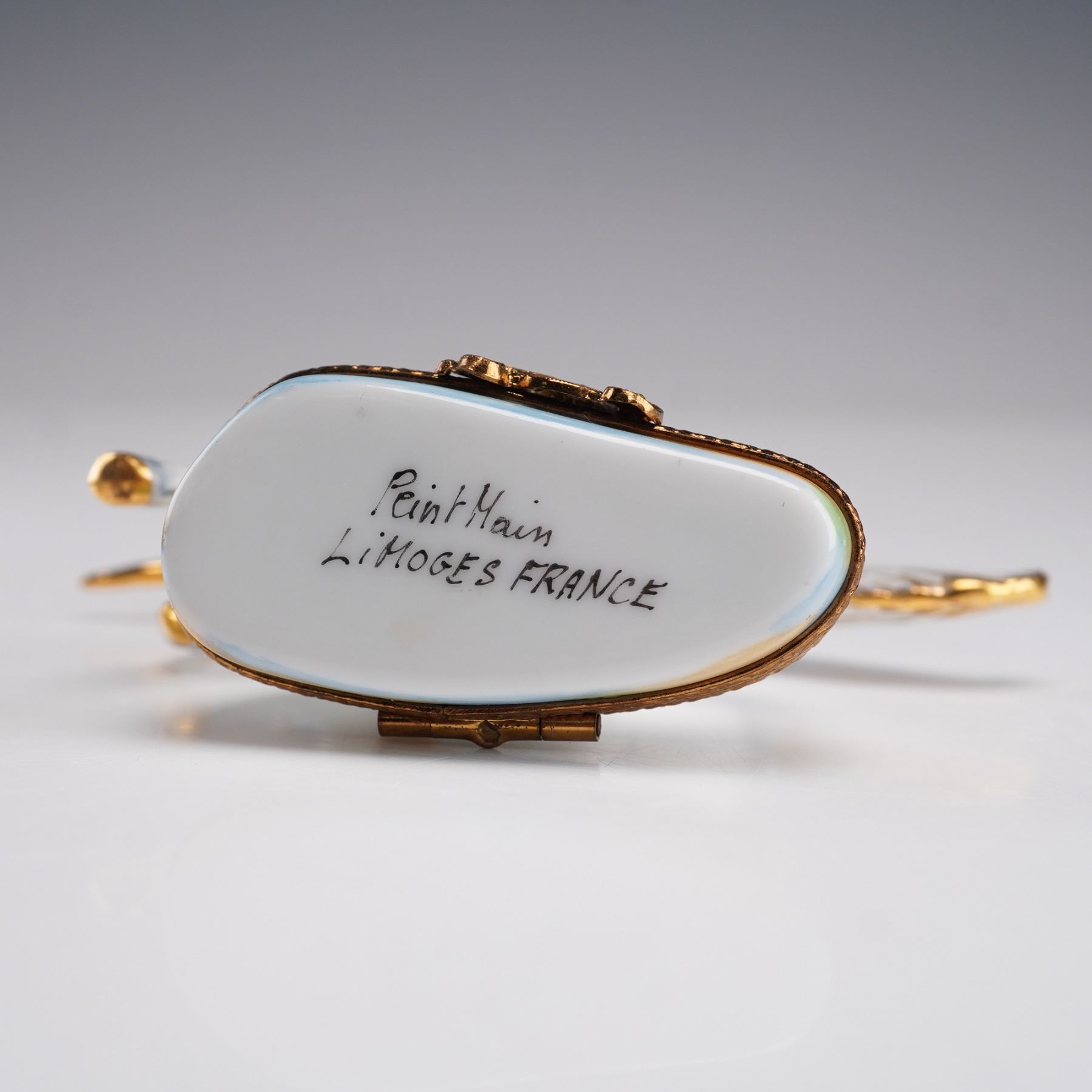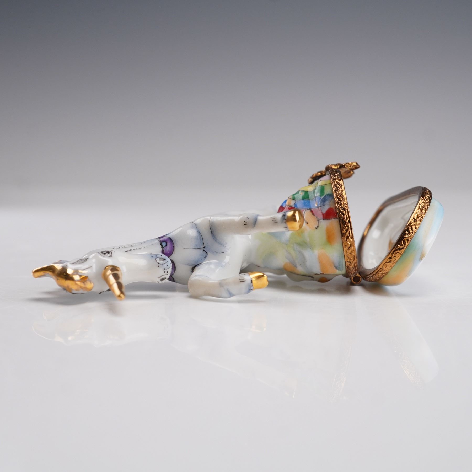 This beautiful hand-painted unicorn ring box is crafted in France, featuring a stunning depiction of a unicorn with a flowing mane, adorned in colorful accents. The detailed artwork captures the unicorn's grace as it stands atop a vibrant base. The piece is signed Peint main on the bottom, marking it as a hand-painted collectible. With its elegant design and use of rich colors, this box is perfect for both collectors of fine porcelain and those seeking a whimsical yet functional piece of art.