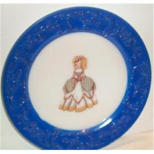 This lovely Hand Painted Milk Glass Plate is hand painted around the outside periphery with a lovely blue trim and in the center there is a transfer of a Victorian Lady. The plate is in SUPERIOR condition with no chips, cracks, or dings and the plate measures 8" in diameter. Sorry to say I don't know the manufacturer.