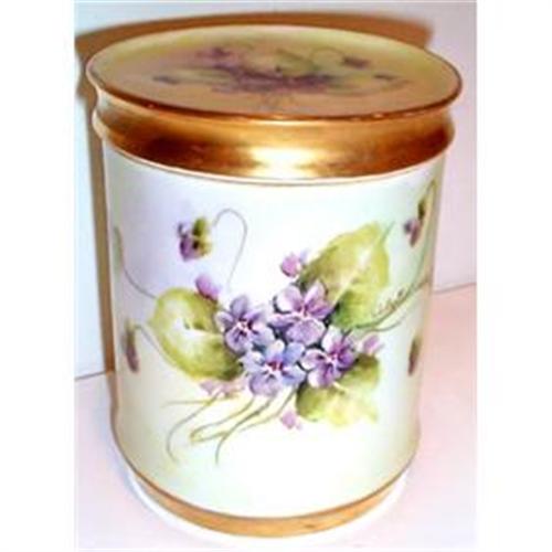 This is an extremely STUNNING and quite well executed Hand Painted piece of Porcelain. It is a Cylindrical Jar with its lid that is decorated with lovely hand painted blooming violets. Even the lid is decorated with the violets. The jar is in SUPERIOR condition with no chips, cracks, dings or hairlines and measures 3.75" in diameter and stands about 4.50" tall. This would look spectacular in your bathroom to hold "Q" tips, or cotton or ???. It would also be great on a dresser to hold your trinkets. The item is artist signed but unfortunately I can't make out the signature. It is also signed on the bottom with the green Germany logo.