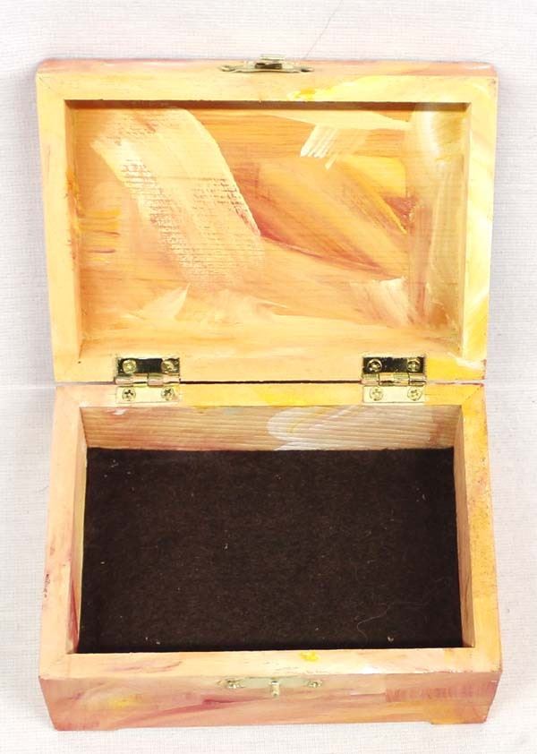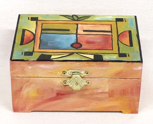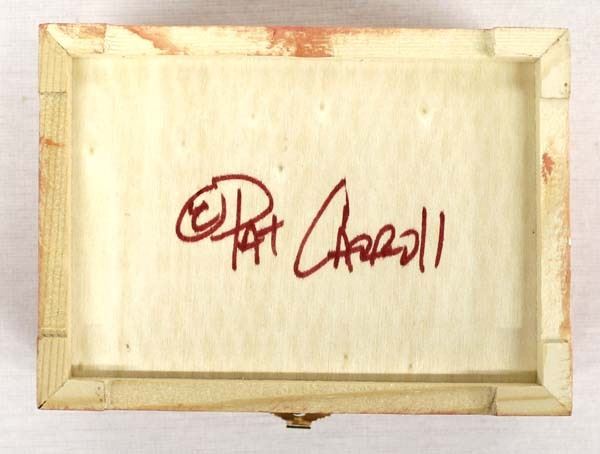 Hand Painted Wood Trinket Box by Pat Carroll, measures 3.5'' x 5'' x 2.5'', signed on the bottom, Patrick Carroll (1949-2019)