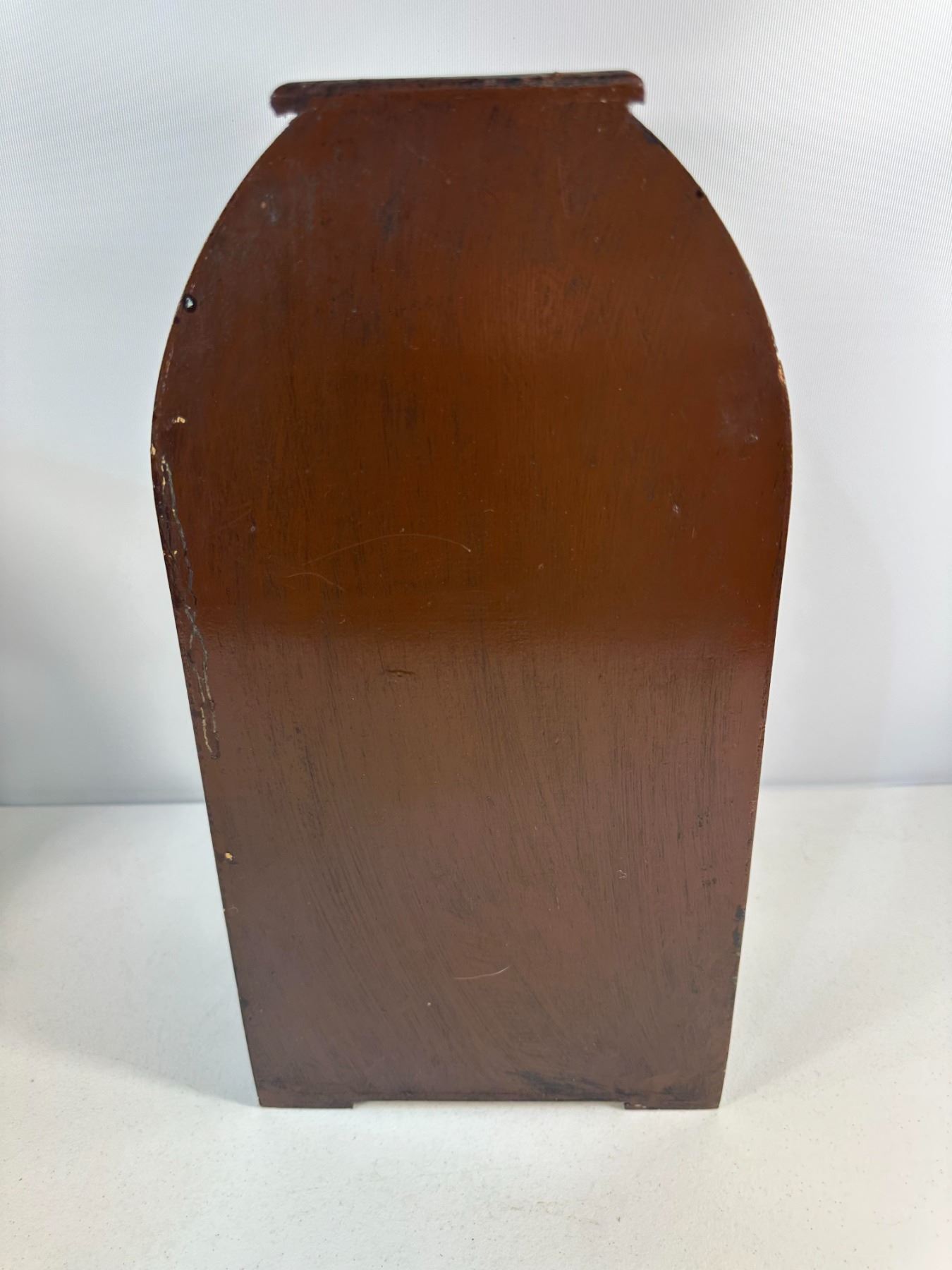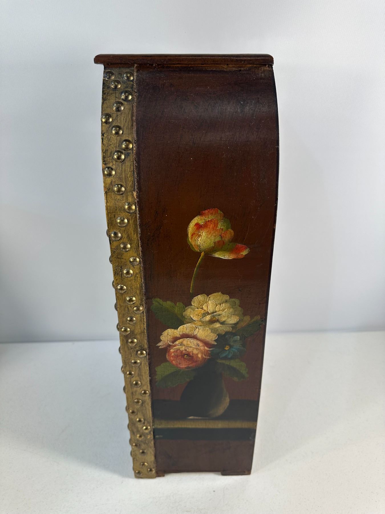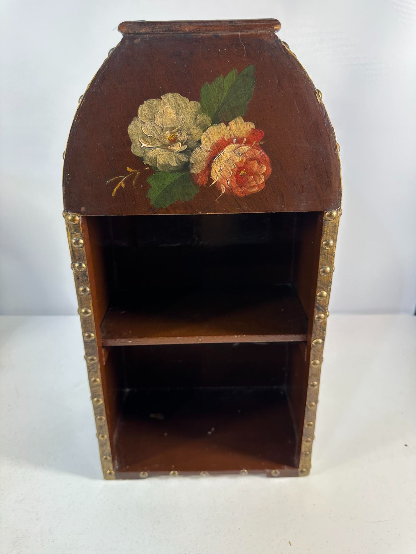 Charming small wooden shelf featuring a domed top with hand-painted floral design and decorative brass stud trim. Perfect for displaying small collectibles or adding vintage character to any space. Approx. mid to late 20th century. Good vintage condition; light wear consistent with age.