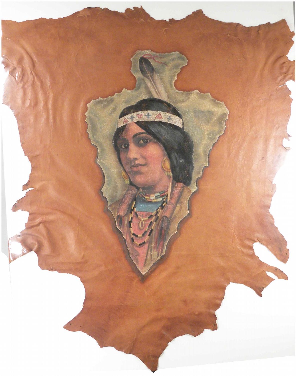Hand Painted Leather Hide. Depicting Native American Indian Squaw. Artist, J.W. Rhine (1840 - 1910). A lifelong resident of Lincoln, Nebraska. Very rare to find a portrait on leather. This one is very well done. Circa 1900. Excellent condition. 35 X 44 inches.