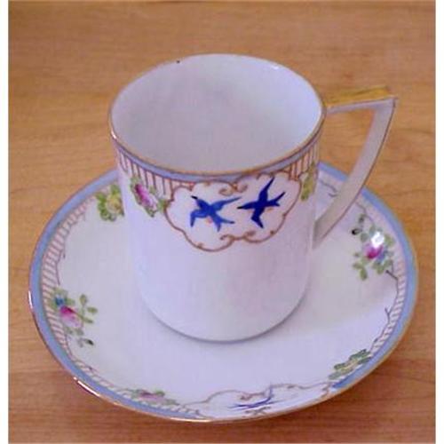 Exquisite very fine china,hand painted antique demitasse set or more accurate i think chocolate cup & saucer, Made by highly collectible NIPPON from bone china, Love the delicate decoration applied by hand featuring tiny blue birds " framed" with gold "frame" in raised style, Excellent condition free of chips or cracks - Cup stands 2 3/4" high and 2 1/4" in diam. and saucer 4 3/4" in diam., US Buyer please pay 7.00 for insured shipping, Thank You so much for looking!