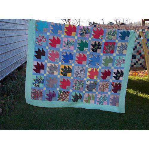 </font></strong>This is a very colorful Maple Leaf quilt all hand quilted.Measures 84x76.There are a few spots on one end on the back that I am sure will wash out.I have not laundered this but it looks like they would.Very nice work on this quilt.</font>