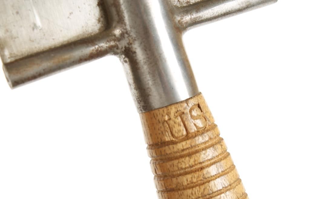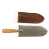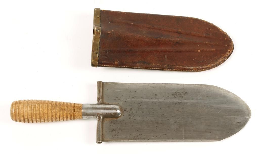 Small hand trowel with wood grip marked "US". Includes original leather case with brass trim, also stamped "US". The shovel has some mottling of the metal, and slight scratches and dings to the wood. The case shows wear with discoloration tears, and edge damage. The shovel is approx 12-1/2" overall with 8" blade, the case is approx 8".