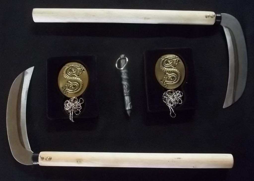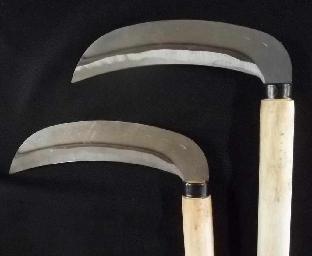 Ready to finish handles on the Sickles.,Two Serpent Neck Knives and a Steel Serpent Kubaton
