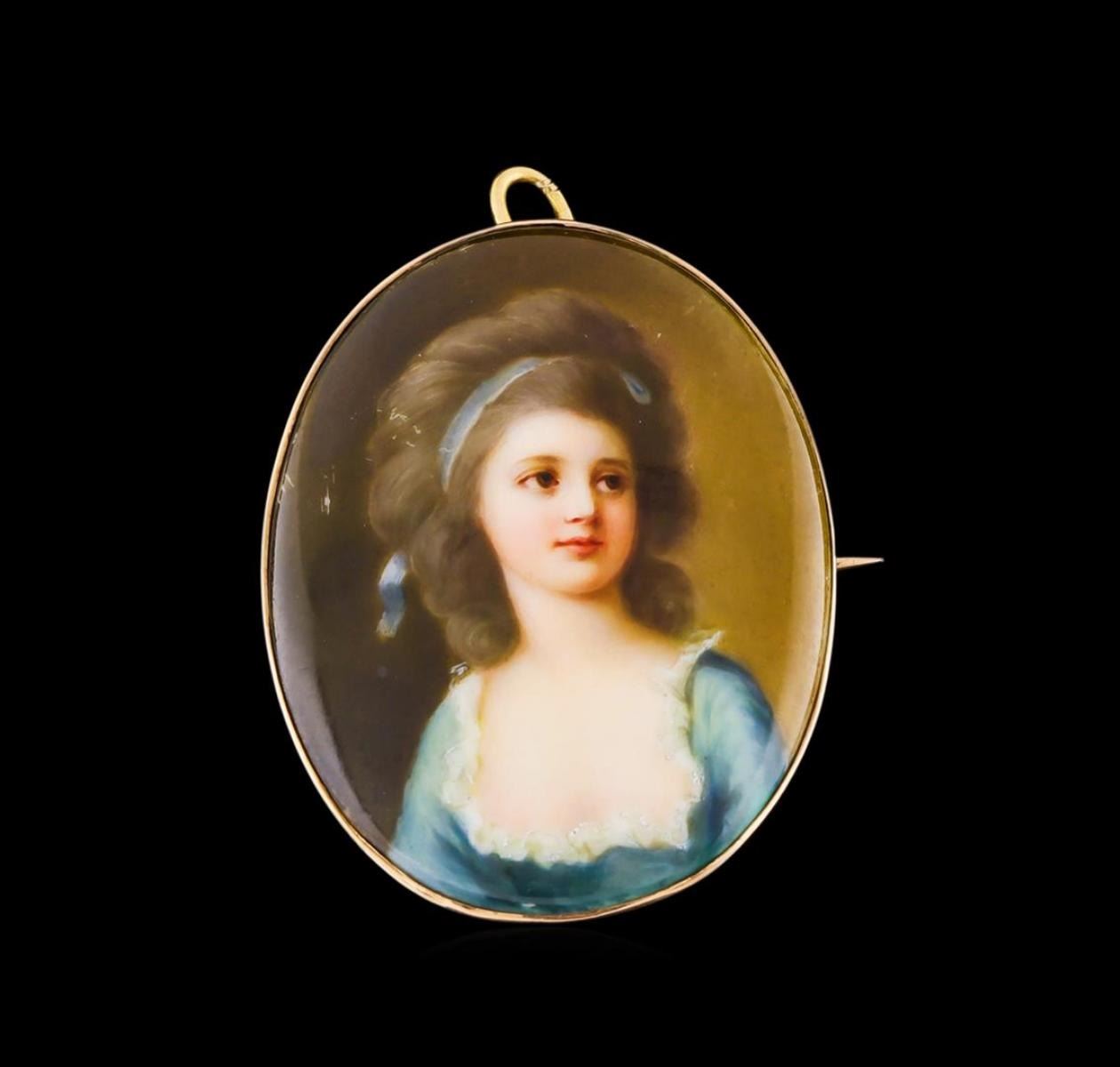 One hand signed Franz Till 14KT yellow gold porcelain pin. The portrait of an elegant lady, who is probably German, and is signed "F. Till Dresden". It dates from 1890-1910. The signature is that of Franz Till of Dresden, who Blattel advises was active around 1866. Blattel notes that he was known for portraits on porcelain, copies, and photographs. Blattel makes a further note; "Porcelain Painting Company: Vienna and Meissen style". Thus it is not clear if perhaps, Franz Till started as an individual painter, and then grew into a company which was active for the remainder of the 19C. Comes with original box.