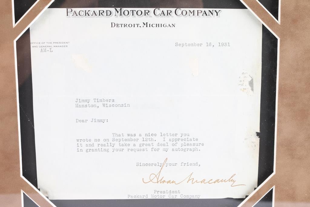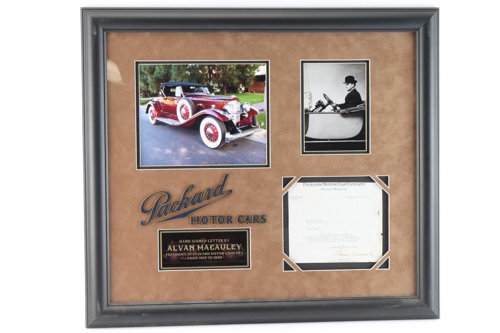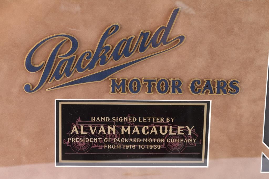 President of Packard Motor Company from 1916 to 1939. Framed with photographs and brown suede matting. Measures 28" x 25".