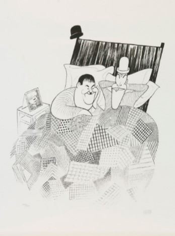 Hand signed limited edition lithograph after Al Hirschfeld "Laurel and Hardy". Hand signed by the artist in a limited edition series. Hand pulled lithograph of a Hirschfeld illustration: The comic duo in bed as a nod to their classic film “The Devil’s Brother” directed by Hal Roach and Charley Rogers in 1933. Unframed dimensions approximately 21x27.