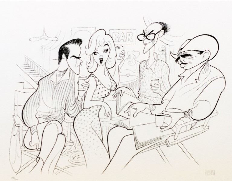 Hand signed limited edition lithograph after Al Hirschfeld "Misfits". Hand signed by the artist in a limited edition series. Hand pulled lithograph of a Hirschfeld illustration: Arthur Miller and Marilyn Monroe featuring other cast members and screen legends, Montgomery Clift and Clark Gable on the set of The Misfits. Miller wrote the movie specifically for his wife, Marilyn. Sadly it was to be her last film, as it was also for Clark Gable. Unframed dimensions approximately 21x27.