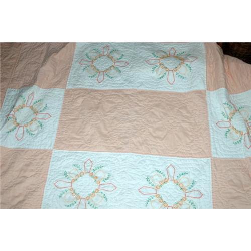 Hand Made Quilt with embroidered patterns. It measures 84" x 102".<p> The condition is very good. I see no tears or broken seams. Some of the edges don't look a bright white as it once did when new. It has recently been washed.