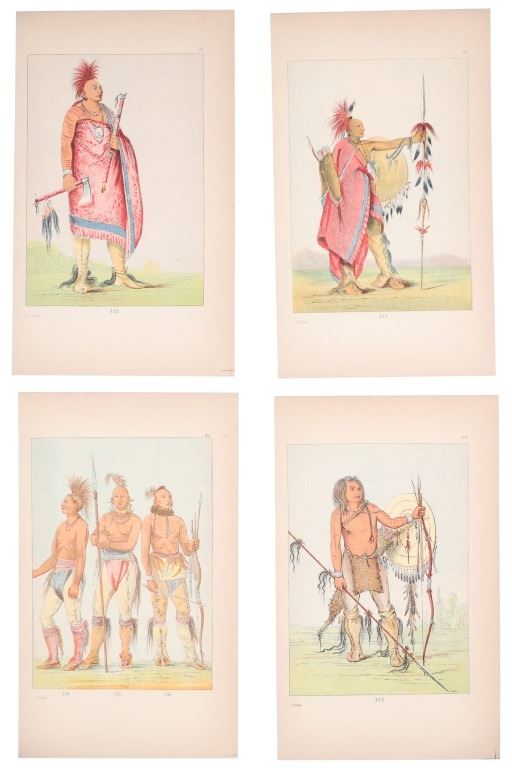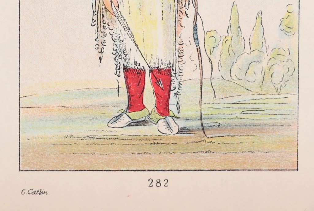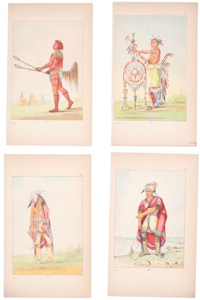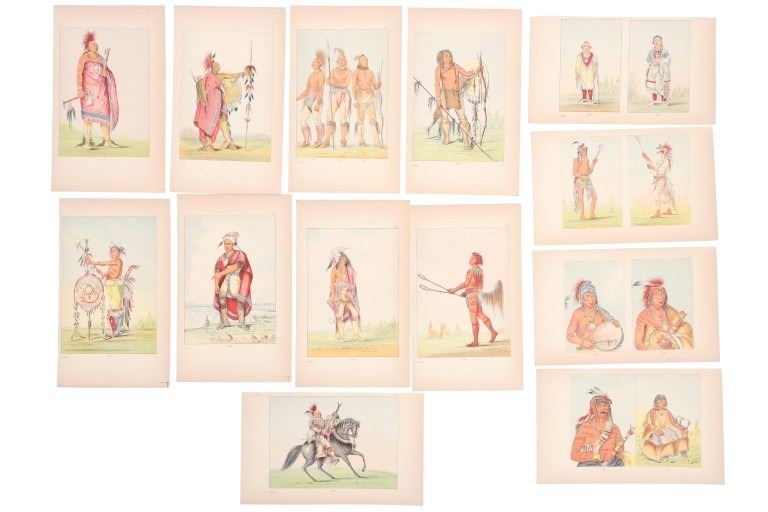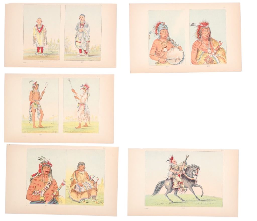 For your consideration are thirteen, 19th-Century, hand tinted George Catlin (1796-1872) etchings of Native American pictorial drawings and illustration plates, from "Illustrations of the Manners, Customs & Condition of the North American Indians With Letters and Notes, Written During Eight Years of Travel and Adventure Among The Wildest and Most Remarkable Tribes Now Existing" by George Catlin 1841. George Catlin (1796–1872) was a 19th-century American painter, author, and traveler who famously abandoned a legal career to document Native American life, creating over 500 paintings known as his "Indian Gallery". Driven by a desire to preserve the appearance and customs of what he termed a "vanishing race," Catlin traveled extensively through the American West in the 1830s, visiting over 48 tribes. This lot features portrait and full body etchings of various Native Americans in various outfits and carrying various items. One of them sits on a horse. Four of the pages feature a double plate. The plates included in this lot are as follows: 152, 153, 154/155/156, 172, 205, 206, 223, 233/234, 244/245, 235/236, 281/282, 289 and 290. They feature golt gilt edges along the top. They show good condition overall with little wear present and no signs of damage is noted. The visible art measures 6 3/4" L x 4 3/4" W, while the entire page measures 9 7/8" L x 6" W. They have a collective weight of under 6 ounces.