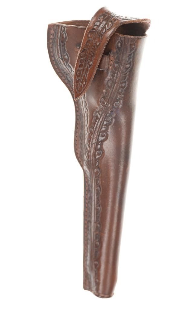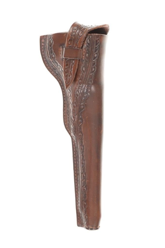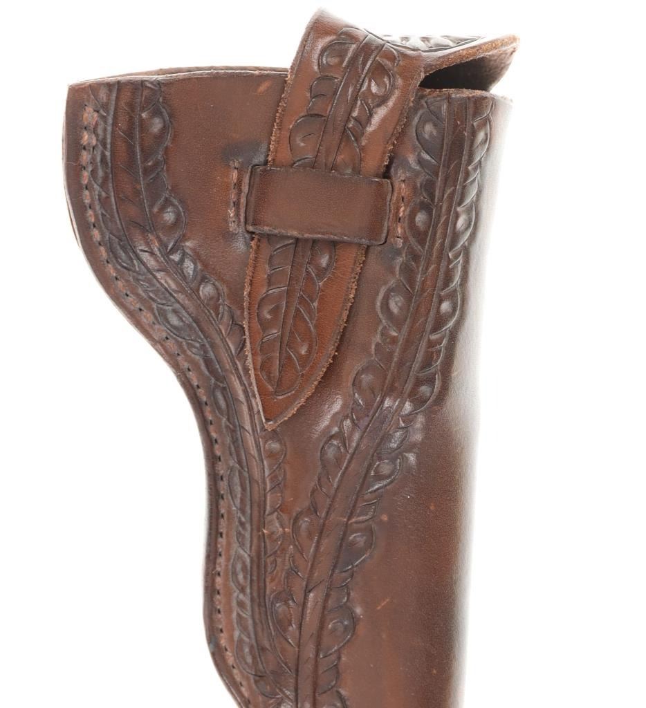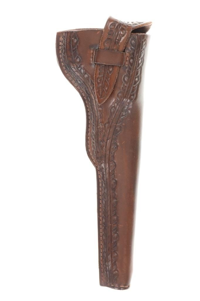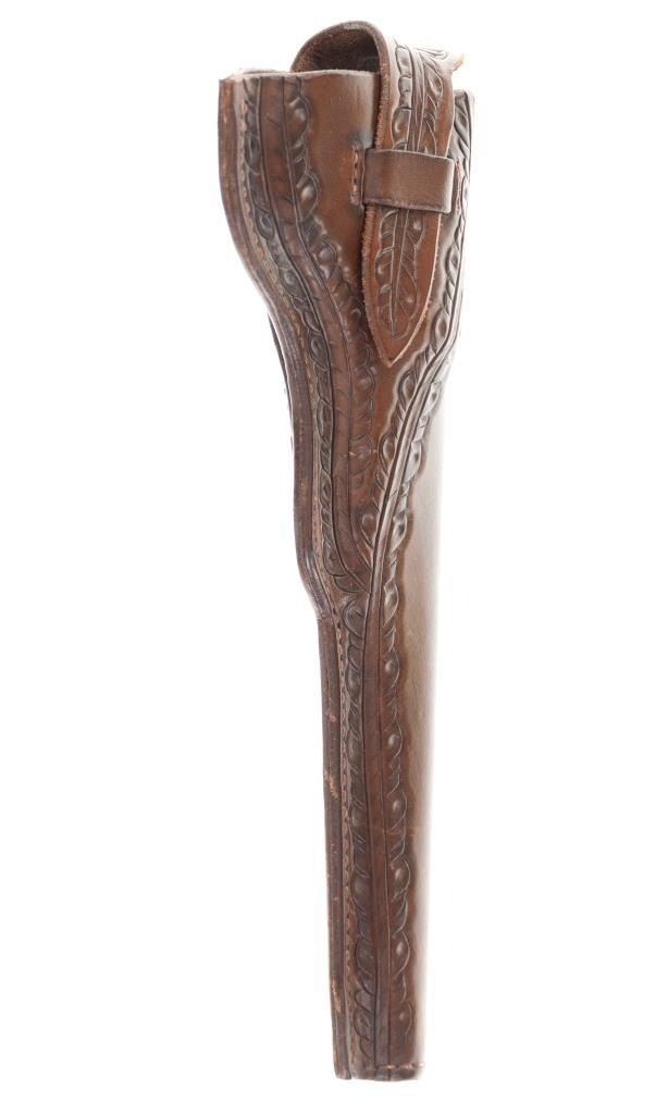 Featured in this lot is this hand tooled and carved Colt Navy Model 1851 holster handmade by Sonny Cranson. The holsters were handmade by Sonny Cranson, a Montana craftsman, early in his career as a holster and ammo belt maker. The holster is handmade with quality leather and show sturdy construction and excellent craftsmanship. The holster shows a deep brown finish with tooled patterns along the face of the holster and to the edge and on the strap to secure the pistol. The condition of this holster is good with no obvious signs of damage and shows good overall condition. The measurements of this holster is 11 1/2" x 4" x 2 1/4". The collective weight of this holster is U6oz.