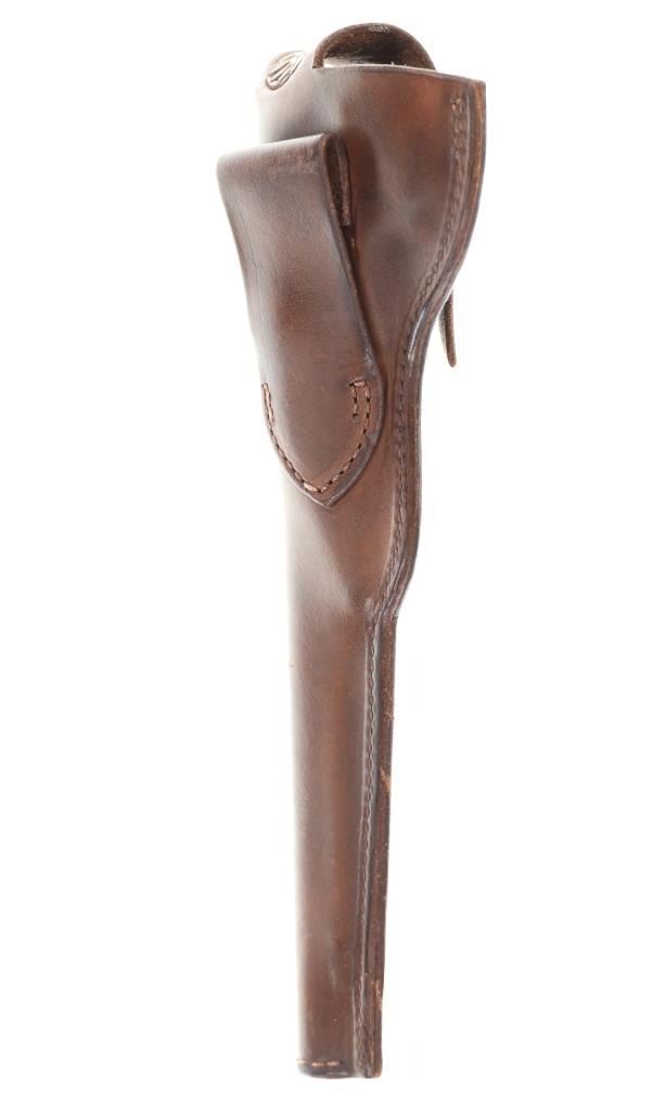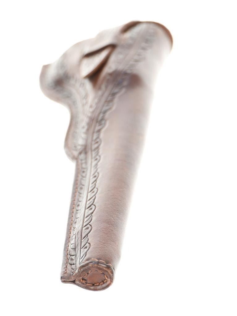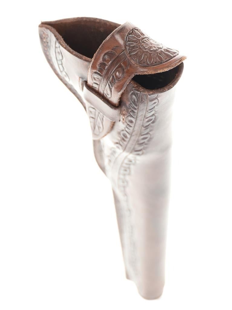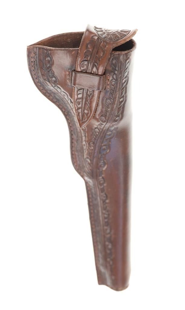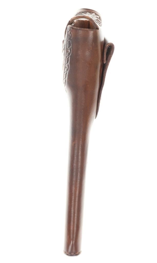 Featured in this lot is this hand tooled and carved Colt Navy Model 1851 holster handmade by Sonny Cranson. The holsters were handmade by Sonny Cranson, a Montana craftsman, early in his career as a holster and ammo belt maker. The holster is handmade with quality leather and show sturdy construction and excellent craftsmanship. The holster shows a deep brown finish with tooled patterns along the face of the holster and to the edge and on the strap to secure the pistol. The condition of this holster is good with no obvious signs of damage and shows good overall condition. The measurements of this holster is 11 1/2" x 4" x 2 1/4". The collective weight of this holster is U6oz.