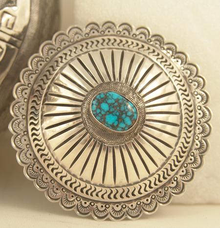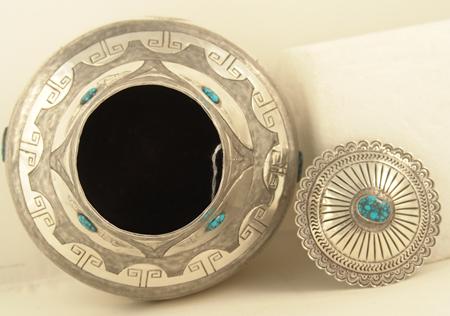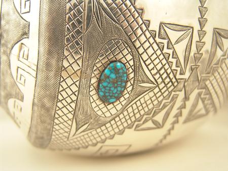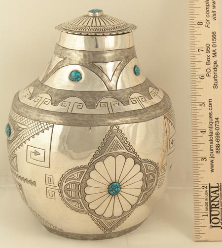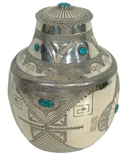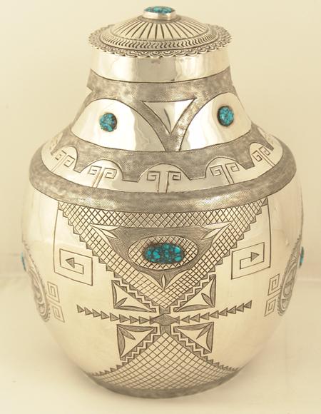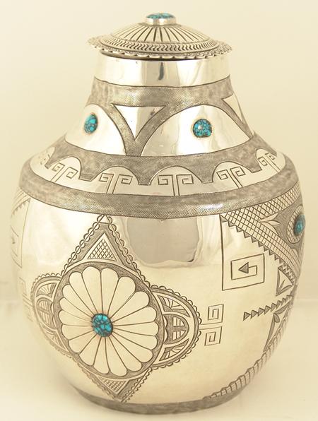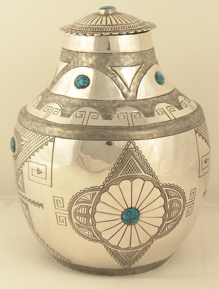 Exquisite hand hammered sterling urn with lid done in more traditional Navajo style with intricate original design stamping and set with nine Landers cabochons, with first place special award ribbons from Gallup Ceremony. 1975. Appraisal value $12,000. 8"