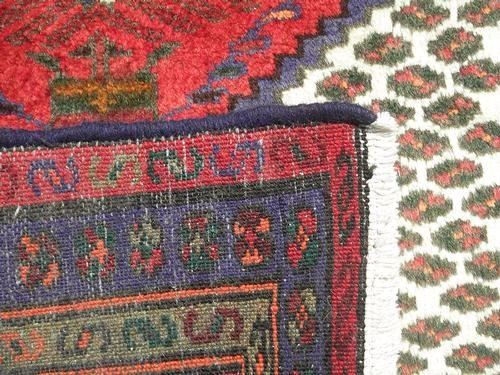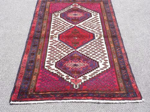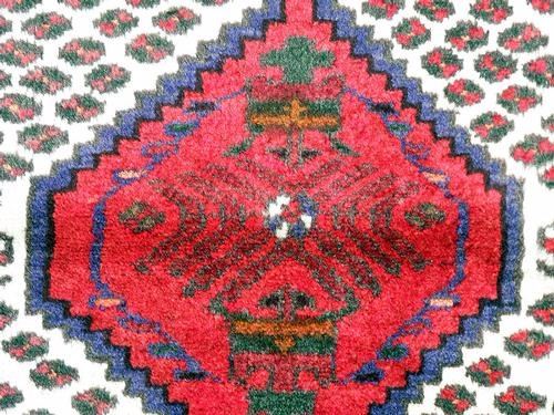 Beautiful Authentic Hand Made Persian Hamadan. Size 5.0 X 3.1 feet, made of fine quality baby lamb's wool pile on cotton foundation, all natural vegetable dye, incorporating a series of central medallion on a white background in floral and geometrical design. This rug is beautifully desgined with a multilayered and multicolored designs.
