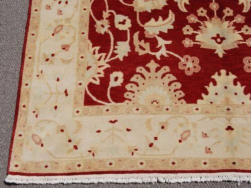 Nicely contrasted handmade allover design area rug. Size 8.8 x 11.11 feet; made of fine quality lamb's wool pile on cotton foundation, all natural vegetable dye, this beautiful rug incorporates a set of large floral patterns on a red background. With very rare and nicely defined colors, and encapsulated by an intricately done floral border. Hand woven in Pakistan.