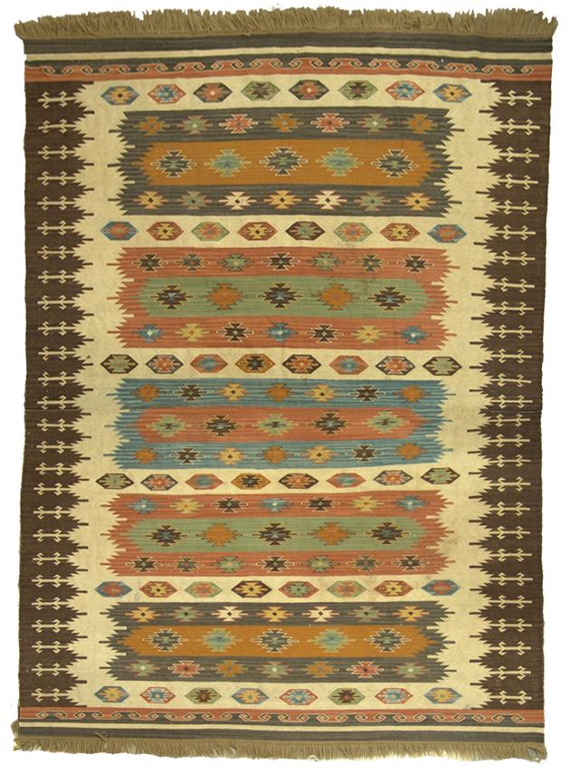 Mid 1900s, Huge and colorful, sturdy woven floor rug with interesting designs and fringed ends; very good condition. 130" x 99"
