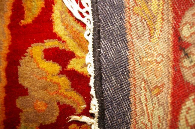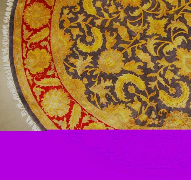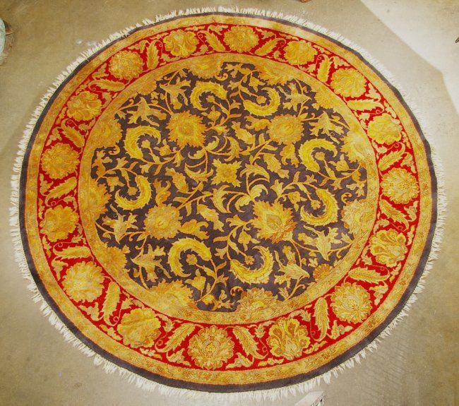 Hand Woven Indo Agra 9'3" x 9'3" , floral design on a mostly black background with burgundy and gold tones. Condition: Very Good