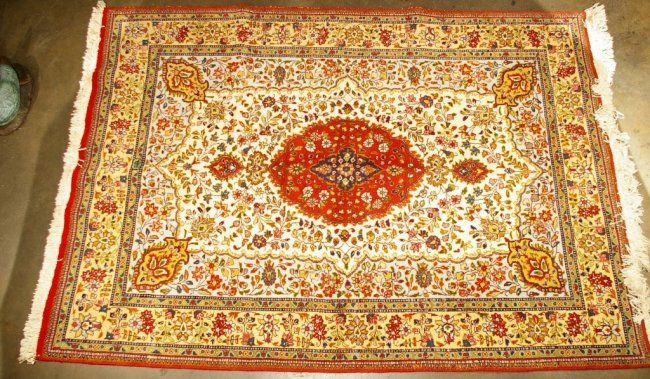 Hand Woven Persian Tabriz 6' x 8'7", beige, blue, burgundy and gold tones. Condition: Very Good