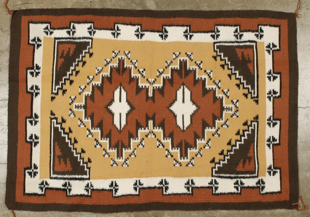 Double diamond and geometric design in gold, brown, black, and white. Finely woven tapestry quality piece. In good condition with no damage. Approx 25" wide x 36" long.