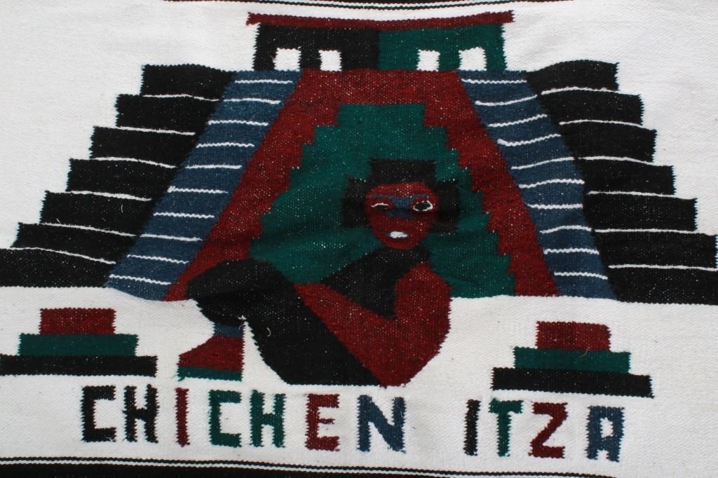 Offered in this lot is a 1960's era hand woven serape throw from Chichen Itza. Chichen Itza was a large pre-Columbian city built by the Mayas. It is located in Yucatán, Mexico. Chichen Itza was one of the largest Maya cities and it was likely to have been one of the mythical great cities. The city may have had the most diverse population in the Mayan world. The blanket shows a white base with black, blue, maroon, and green bands. In the center of the blanket is a reclining Chac-mool, the Mayan god of rain. Under the Chac-Mool are the words “CHICHEN ITZA”. This blanket measures 84" x 48" with 2" fringe on each end. The blanket is made of cotton and is in very good condition.