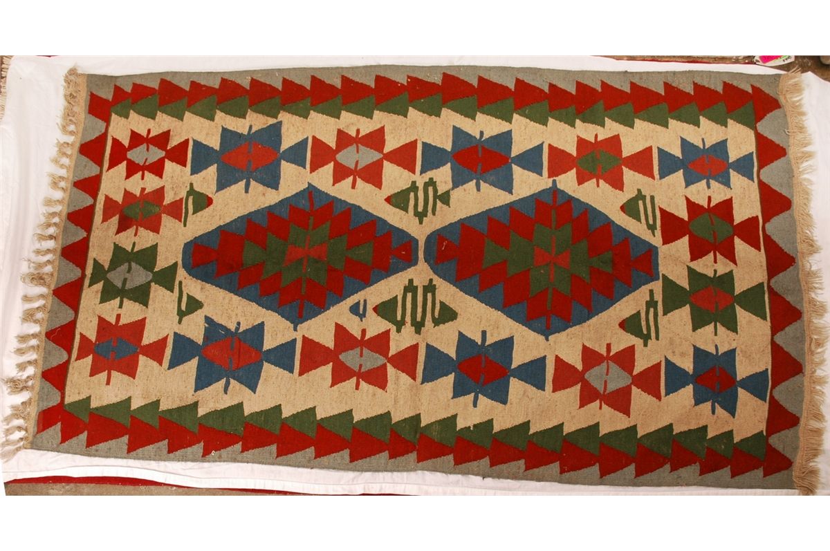 Hand woven Vintage Turkish Kilim rug 6' x 4' red, green, beige and blue tones.