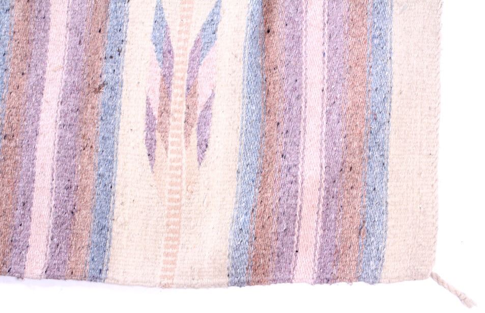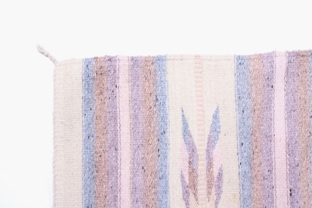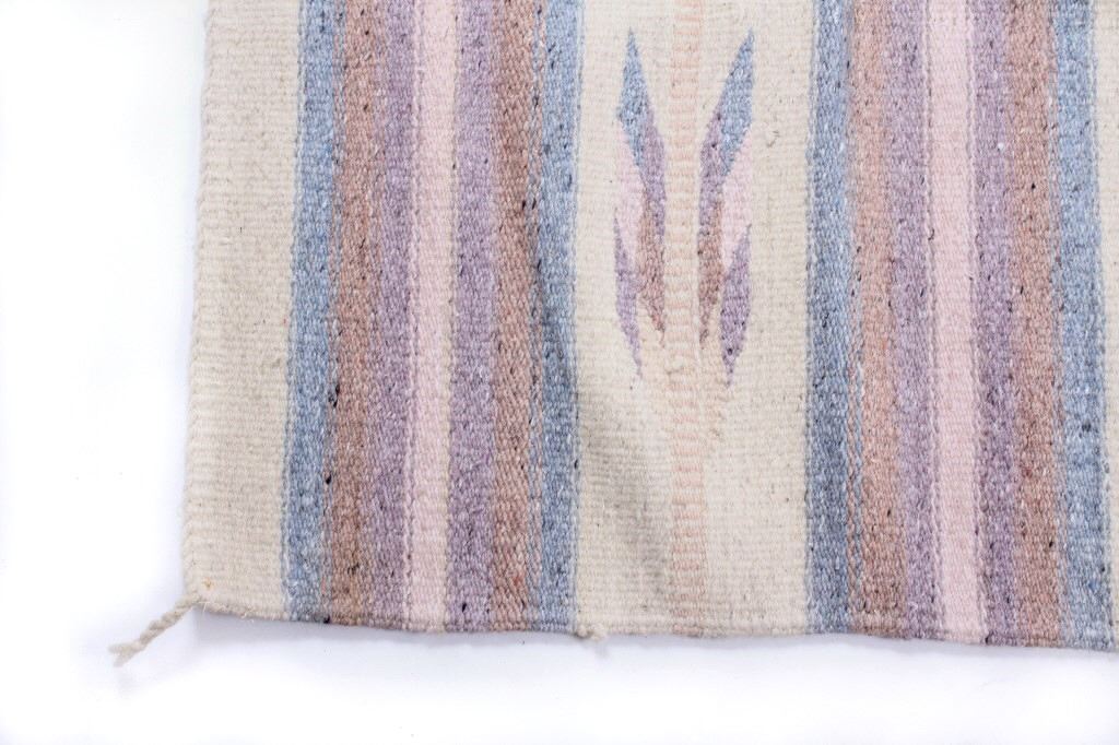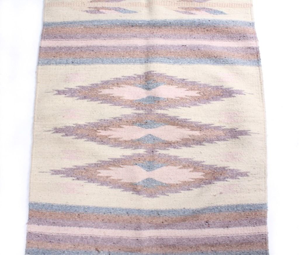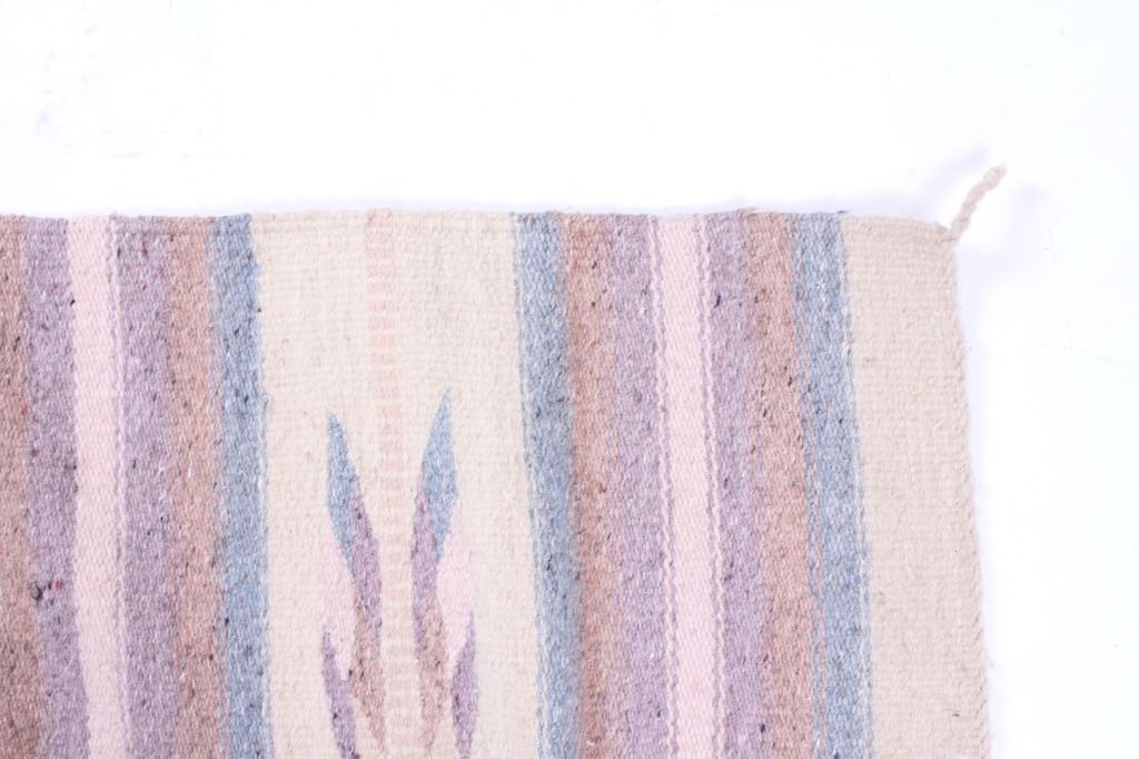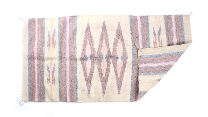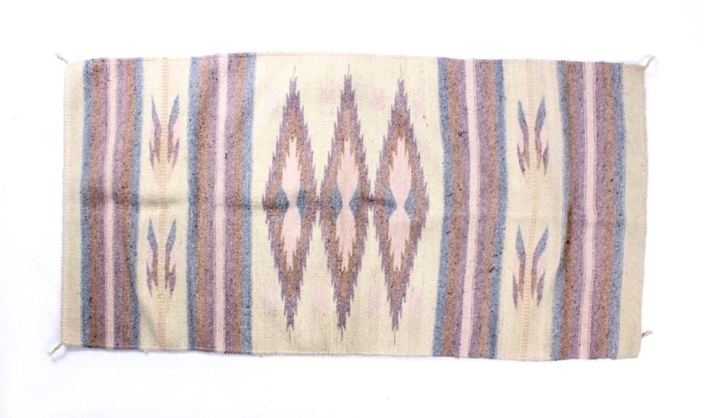 Offered in this lot we have a Zapotec Native American hand woven wool rug. The rug shows vibrant colors with a excellent tight weave. It shows wonderful geometric patterns at the center with bands of color on the ends. The rug shows colors of pink, light blue, purple, and off white. The Zapotec people were among the first to learn Spanish style weaving before the Navajo people. Their rugs are highly prized among collectors. The rug shows good condition with a tassel on each corner. It measures 30" x 60".